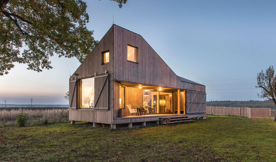 Zilvar House is a modern, energy-efficient wooden retreat designed by the Prague-based studio ASGK Design for a family seeking escape from urban life. Located on the outskirts of a village in Eastern Bohemia, Czech Republic, the compact and open-plan house is surrounded by fields, meadows, and forests. The house's unique and organic design was inspired by the client's four-year-old son, who imagined a building with an anthropomorphic shape that leaned towards the impressive oak tree on the property. Taking cues from this imaginative vision and the local microclimate, ASGK Design created a house that constantly interacts with its natural surroundings. Completed in 2013, the house has a larch timber-framed structure and is built on a pile foundation, raising it slightly off the ground. The elongated, single-story form features a pent roof that angles toward the oak tree. The facade, interior, and roof are clad in larch boards. To increase durability against the region's strong winds and rain, the exterior wood underwent a "burn and stain" process. The interior features lighter, natural wood finishes. Designed as a low-energy house, Zilvar utilizes a "diffusion-open" wall assembly that allows moisture to pass through the structure, eliminating the need for a plastic vapor barrier. A wood-burning stove and radiant floor heating provide warmth. Large, floor-to-ceiling windows and sliding glass doors blur the line between the indoors and outdoors, creating the illusion of a larger space. Same wooden flooring is used both inside and on the eastern terrace, creating a seamless connection to the garden. Large sliding wooden shutters provide shade from the summer sun while allowing winter solar gain. Sheltered outdoor areas are strategically placed at the northern entrance and eastern terrace to provide protection from the elements year-round. The ground floor contains an open-plan living area with a kitchenette and dining space. Two raised galleries at opposite ends of the house, accessed by industrial-style staircases, serve as bedrooms. Project credits Architect: ASGK Design Photographer: Petra Hajská Location: Lodín, Czech Republic Project name: House Zilvar
