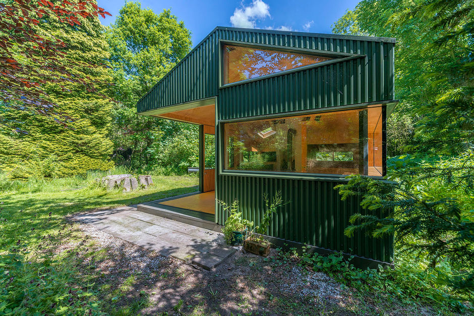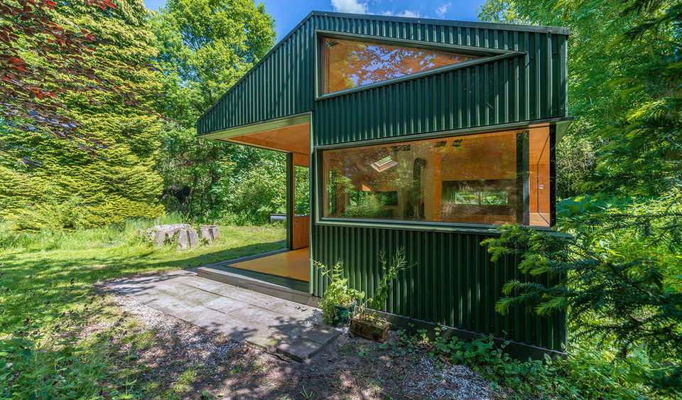 In 2015, Amsterdam-based CC-Studio unveiled "Thoreau's Cabin," a discreet off-grid shelter nestled within the expansive 5,900-acre Noorderpark in Utrecht, Netherlands. Conceived as a warm and dry retreat for the volunteers who maintain the park, the 35-square-meter cabin was designed to harmonize with its natural surroundings, rather than dominate them. The cabin's design cleverly employs a strategy of camouflage, making its presence barely perceptible until one is close to it. The volume is shaped and the exterior is clad in a green aluminum envelope to allow it to be concealed by the forest's lush foliage. Two large sliding doors on one corner can be fully opened, seamlessly blending the interior with the surrounding meadow where sheep graze. This allows occupants to control their level of exposure to the outdoors. A sculptural hearth at the cabin's center supports a folding aluminum-clad roof structure, creating an open canopy that extends the protected space outwards. The cabin was built without requiring a permit because it replaced a pre-existing 1966 cottage of a similar size and function, which had served as a break and storage shelter for park maintenance. The new design, however, features thoughtful updates and sustainable touches. The cabin was intentionally designed without electricity or running water, reinforcing Thoreau's ideals of simplicity and self-sufficiency. A sculptural hearth functions as the central element, providing heat from local firewood. It serves as a combined kitchen and fireplace. The interior includes a washroom with a washbasin, a small storage area, and a larger general space centered around the stove. Wooden panels line the interior walls, providing a sense of warmth and natural elegance that contrasts with the minimalist metal exterior. Project credits The project was designed and executed by the team at CC-Studio. Architects: Peter Heideman and Danny van Kessel. Engineering: Gerald Lindner. Contractor: Van Zoelen bv.