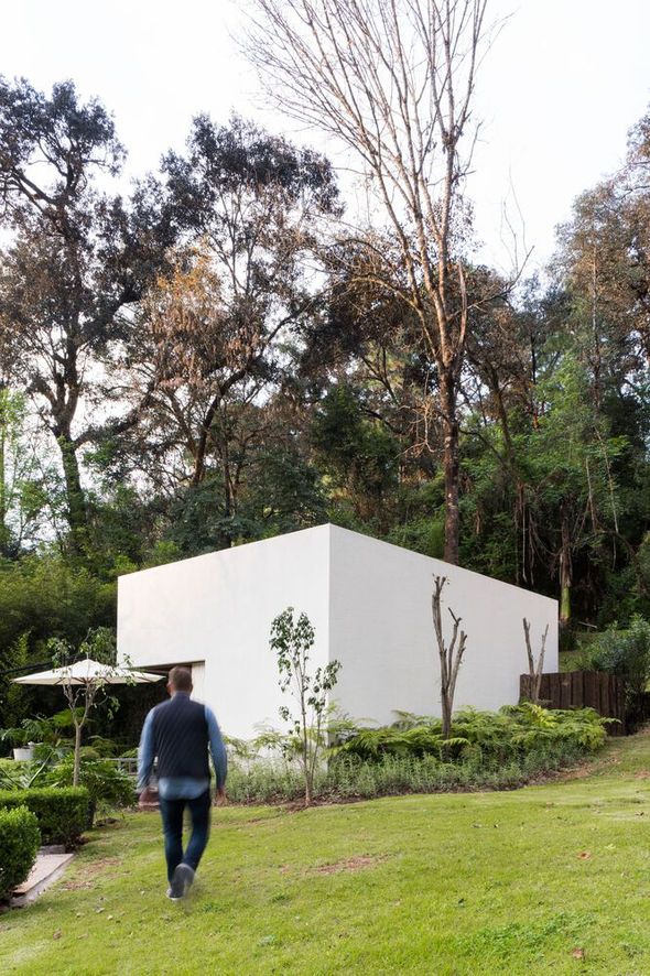 The VR Cabin is a vacation refuge designed by Mexico City-based firm CRB Arquitectos. Completed in 2021, the 90 m² project is located in the forested area of Avándaro in Valle de Bravo, Mexico. The cabin was conceived as a space for its users to disconnect from city life and reconnect with the surrounding nature, with a design that emphasizes warmth, simplicity, and a seamless coexistence between the cabin and the forest. The core concept of the VR Cabin is to offer a serene escape where the user can fully experience the tranquility of their forested environment. This connection is achieved through a deliberate design approach: The cabin's exterior is a simple, solid block, which ensures the natural landscape remains the focal point. In contrast, the interior is richly lined with wood to create a warm and cozy atmosphere. The design blurs the line between indoor and outdoor spaces through a series of thoughtful connections. A large front terrace allows occupants to immerse themselves in the surrounding greenery, while the private area features a bathroom and dressing room that open directly to the outdoors. The 90 m² cabin features a simple yet highly functional layout that focuses on maximizing comfort and the connection with nature. The main living area is an open-plan space containing a lounge area with a fireplace, a bedroom space, and a small office area. A ladder provides access to an upper-level sleeping loft, with gabled wooden roofs that evoke the feeling of a classic Nordic cabin. A secluded space for contemplation is integrated into the design, surrounded by lush vegetation. A unique outdoor shower, also surrounded by foliage, provides a direct and immersive connection with the natural surroundings. The material choices for the VR Cabin were selected to create a warm, welcoming, and harmonious atmosphere that complements the natural setting. The extensive use of wood throughout the interior, including the gabled roofs of the loft, provides thermal comfort in Valle de Bravo's humid climate and creates a soft, cozy aesthetic. While the interior focuses on wood, the exterior is defined by a simple, solid block form. Although details on the specific exterior finish are limited, CRB Arquitectos frequently uses materials like earth-toned exposed concrete in their projects to allow structures to age naturally. Project Credits Architects: CRB Arquitectos (Mexico). Lead Architects: Sebastián Canales and Javier Rivero Borrell. Location: Avándaro, Valle de Bravo, Mexico. Area: 90 m². Year of Completion: 2021. Photographs: Arturo Arrieta. Manufacturers: Cemex, Grupo Arca.