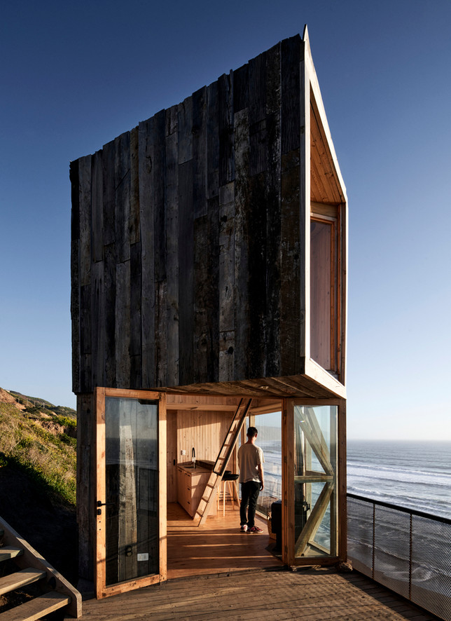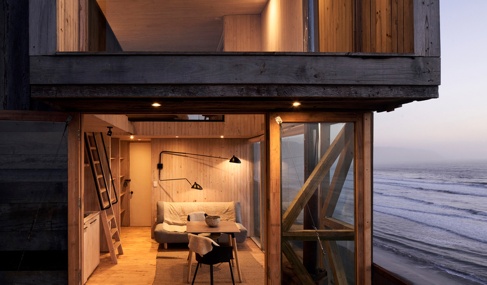 Located in Matanzas, Chile, the cabins La Loica and La Tagua were designed by Croxatto y Opazo Arquitectos as minimalist holiday homes that blend with the surrounding coastal environment. The project is defined by its strategic position on a steep, wind-swept hill, offering expansive views of the Pacific Ocean. The project's design focused on creating small-footprint volumes that respect the natural landscape while maximizing coastal views. Named after native bird species—La Loica and La Tagua—the cabins use vertically stacked rooms to create a lookout-tower effect. The cabins are situated on Lagunilla hill in Matanzas, Navidad, approximately 80 meters above sea level and 2.5 hours from Santiago. From this vantage point, they overlook the "Lobera," a large rock formation in the The cabins are built entirely of wood, using a timber pylon structure to support the main platform on the steep terrain. The exterior cladding is made from reclaimed oak sleepers treated with petroleum oils to protect against marine corrosion. Interiors feature a limited palette of light-colored wood, creating a warm, simple, and spacious atmosphere. The living area, kitchen, and bathroom are located on the main floor, with a ladder leading to the bedroom in the loft. Large, west-facing windows enhance the feeling of hovering over the ocean and dominate the horizon. North-facing terraces extend the interior spaces and are positioned to provide a shield against the region's strong southwest winds. To combat the small footprint (La Loica at 20 m² and La Tagua at 25 m²), the double-height living room creates a perception of more expansive space. The project initially operated off-grid, requiring the use of a water tank and electric generator for the construction process. The cabins were designed for two different clients, and the firm’s main goal was to connect the inhabitants with nature. Project credits Architects: Croxatto y Opazo Arquitectos. Lead Architects: Nicolás Opazo Marchetti and Felipe Croxatto Viviani. Photography: Cristóbal Palma / Estudio Palma.
