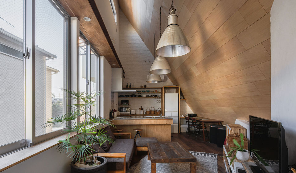Constructed in 2019, the 87.23-square-meter House 8.5 is an atelier-style residence designed by the architecture studio DOG for a painter, his wife, child, and mother in Ninomiya, Japan. Situated along the historic Tokaido Road, the design is a poetic nod to the area's artistic heritage, a path once walked and drawn by the renowned ukiyo-e artist Hiroshige. The house presents a striking sculptural form, defined by its steep, sloping roof that doubles as a wall on the northern facade. In a neighborhood of relatively uniform three-story buildings, House 8.5 stands out through its dynamic form while maintaining a respectful scale. Its intriguing shape and visual angles vary depending on the viewer's position, offering a source of creative inspiration for the resident painter. The interior is cleverly organized to separate the family's living area from the artist's studio using a large, diagonal exhibition wall. This wall, oriented along the maximum diagonal length of the site, provides a prominent space for displaying the painter's work to both the family and the outside world. A glass entrance on the sloped facade offers a glimpse into the atelier from the street. The interplay between the diagonal exhibition wall and the sloped roof creates a three-dimensional effect, with spaces that feel alternately wide and narrow, high and low. Rooms are located on the ground floor, while the kitchen and living room are situated on the first floor. The interior features a white-tiled bathroom and finishes that complement the house's clean, geometric lines. Credits Architects: DOG (Ryutaro Saito + Shun Ide*Nikken Housing System) Structural Engineer: Yasuhiro Kaneda Builder: Shinshin Construction Co.,Ltd. Photographs: Satoshi Takae, Shinkenchiku Location: Ninomiya, Kanagawa Prefecture, Japan Year: 2019 Area: 87.23 m² (Total Floor) Manufacturers: Vectorworks, Duravit, Adobe, Aica Kogyo Compamy Limited, LIXIL, Nagoya Mosaic, Tile Park, Trimble Navigation, ikuta