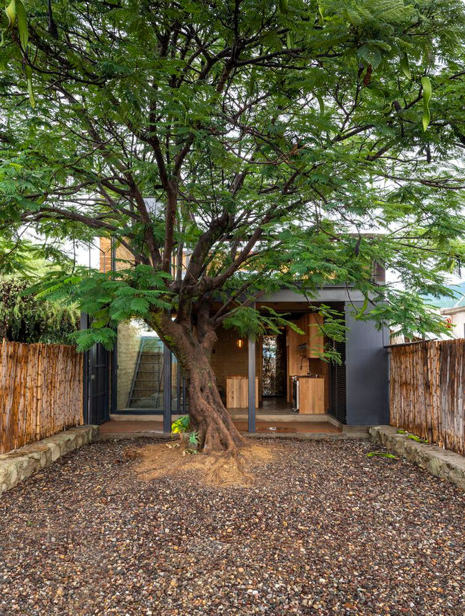 Completed in 2022 in Oaxaca, Mexico, the Plúmula Workshop House is a 70-square-meter project by Espacio 18 Arquitectura that breathes new life into a dilapidated residence to create a functional and poetic live-work space for an artist. The project's name, Plúmula, which refers to the embryonic shoot of a plant, reflects the design's focus on new growth and revitalization. A central aspect of the design is the preservation of pre-existing adobe walls, honoring the building's history, while a lightweight steel framework is integrated to reinforce the structure and expand the space. The house was commissioned by Amy García Kennedy, a plastic artist who works abroad and wanted a retreat in her home country. At the heart of the design is a magnificent Flamboyán tree, which the architects made the focal point of the property, with key views from the workshop, meeting space, and bedroom all centered on its contemplation. The layout was designed for practicality and warmth, utilizing a sensitive monochrome palette that visually enlarges the interiors. This is achieved through the use of budget-friendly, locally sourced materials such as steel, adobe, pine wood, and red brick. These materials also create a dialogue between the old and new, and their familiarity to local craftsmen facilitated the construction process. The project employs several sustainable strategies. The existing adobe walls offer natural thermal mass, keeping the home cool during the hot Oaxacan summers and warm in the winters. The house also incorporates a solar water heater and a rainwater harvesting system with filters, while LED lighting was chosen for energy efficiency. Tall sliding windows blur the boundaries between the indoors and the surrounding lush environment, inviting natural light and ventilation and reinforcing the visual connection to the Flamboyán tree. Plúmula Workshop House is a project that responds thoughtfully to its context, integrating into the local neighborhood while offering a tranquil and inspiring sanctuary for its inhabitant. Credits Architects: Espacio 18 Arquitectura Lead Architects: Carla Osorio and Mario Ávila Design Team: Sonia Morales, Karina Flores, Paola Alavez, Renata Balseca, Aranza Toledo, Amy García Kennedy, and Ivonne Kennedy Client: Amy García Kennedy Engineering: LM Estructuras Carpentry: Orvesa y diseño Steel Works: Alfredo y Ramon Photography: Camila Cossio Manufacturers: Cemex, Helvex, Lumileds, Tecnolite