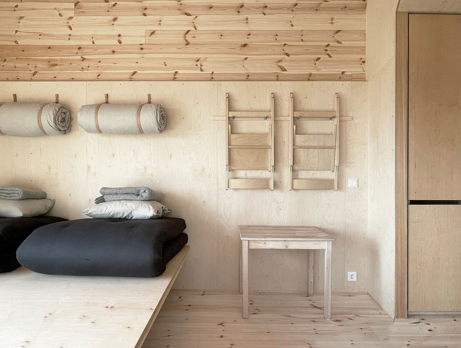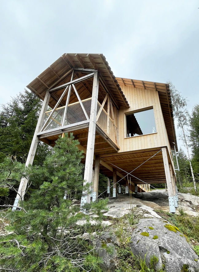 The Bergaliv Landscape Hotel, a project by architect Hanna Michelson, is a secluded, minimalist retreat in the foothills of the Åsberget mountains in Vallsta, northern Sweden. Completed in 2017, the hotel consists of a series of elevated wooden cabins designed to offer guests solitude and tranquility while minimizing their impact on the environment. Michelson, who also works for Tham & Videgård Arkitekter, was commissioned to create the cabins, which draw inspiration from traditional Swedish and Japanese design philosophies. The first cabin, known as Lofthuset ("the loft house"), was followed by the Söderloftet in 2021, and additional hideaways are planned. To reduce its visual impact and respect the landscape, each cabin is built on tall stilts that raise it above the ground and allow it to sway gently in the wind. This positioning gives guests a "high above the tree tops" view of the Ljusnan River valley below. The design is built around a concept of duality, with two contrasting spaces. The lower level of the 10-meter-tall structure is a compact, insulated space housing a combined living and sleeping area. This level features a wooden bench for resting and futon mattresses that can be hung on the wall to maximize space. Above, the upper level is an open-air deck with a gabled pinewood roof, offering uninterrupted views of the surrounding scenery and functioning as a peaceful vantage point. The cabins are constructed using a palette of natural materials. The exterior is clad in heart-pine and spruce wood, allowing the structures to blend into the forest, while the interior features pale birch plywood and ash. Following Nordic building traditions, the walls are insulated with flax fibers. With their minimalist and raw interiors, the cabins are designed to remove unnecessary noise and focus attention on the expansive natural landscape. Credits Architecture: Hanna Michelson / Fria Folket Location: Vallsta, Hälsingland, Sweden Client: Bergaliv Contractor: AJ Hälsinge Renovering & Bygg Manufacturers: Isolina Photography: Courtesy of Bergaliv Landscape Hotel