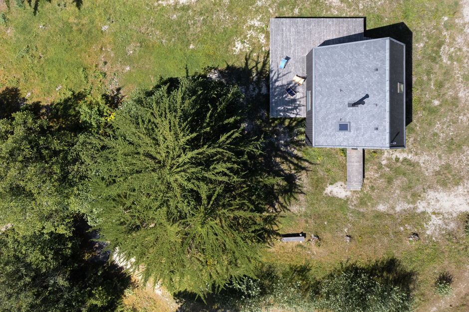 Le Refuge KE01 is a black timber cabin nestled in the dunes of Keremma in Brittany, France, designed by Gayet Roger Architects as a family vacation retreat. Built in 2019, the 850-square-foot cabin (79 square meters) is positioned on a raised platform supported by four-foot-tall metal stilts, which protects it from the area's risk of flooding and preserves the natural terrain. A wooden footbridge connects the entrance of the house to a small path that leads to the nearby beach. The cabin's design draws inspiration from traditional Scandinavian architecture, featuring a dark exterior that allows it to blend into the surrounding landscape of tall cypress trees. The cross-laminated timber (CLT) structure is insulated with blown-in cellulose wadding and clad with rough-sawn wood strips painted with black Falun-style paint, a durable Swedish pigment. At night, the house disappears into the darkness, with only the illuminated windows visible like hanging lanterns. Inside, the warm, spruce-clad living spaces are designed with function in mind, stripped of the superfluous. The architects used rough-sawn wood panels for the built-in benches, dining table, shelving, and counters. The open-plan space is punctuated by strategically placed windows that frame specific views of the landscape. The large fixed window in the corner seating nook offers pastoral scenery, while a western bay window can be opened to extend the main room onto the terrace, blurring the line between inside and outside. Upstairs, the four sleeping areas are designed like small cabins. Each features small, eye-level windows that provide views of the landscape for those lying down and can accommodate two single beds, with a built-in bench on one side and a storage area on the other. Credits Architects: Gayet Roger Architects (Aldric Gayet & Anne Gayet) Location: Tréflez, Finistère, France Completion Year: 2019 Photography: Pascal Leopold Foundation: Techno Pieux Nantes Nord Wood Structure, Insulation, Exterior Joinery, Partitioning & Joinery: SARL Construibois Plumbing, Sanitary, Ventilation, Electricity & Wood Stove: SARL Kerbaul Roofing: SARL BCI