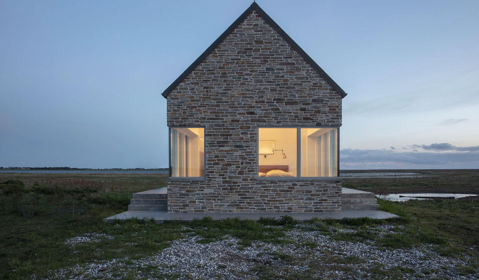 The Summer House, designed by Ginnerup Arkitekter, is a small stone-clad retreat located on a small, scenic Danish island with an open meadow landscape. Completed in 2022, the 55-square-meter (592-square-foot) home was designed to blend harmoniously with its environment, featuring a simple, gabled form and natural materials that minimize its visual impact. The architects intended for the house to be experienced as a gentle addition to the landscape, "a bit like picking up a small stone on the beach". The house is strategically placed on a thin concrete plinth that elevates it slightly from the ground, providing coastal protection from severe storms and elevated water levels. The plinth's aggregate includes small stones, echoing the pebbles and rocks found on the nearby shoreline. The entire exterior is clad in natural stone, a feature that helps it harmonize with the rocky beach and meadowland. The exterior's rustic appearance and the pitched roof, covered in light slate tiles, give the house a calm and subtle presence. Inside, the summer house offers a stark contrast with a minimalist and slick interior designed to allow the dramatic surrounding scenery to take center stage. Hard stone floors, a beautifully crafted kitchen, and a neutral color palette contribute to a simple yet high-quality finish. The full-height interior is organized into two areas: a main open-plan living space and a section with the bedrooms and a bathroom. Large windows and French doors are placed in the corners, allowing for abundant natural light and framed views of the island landscape. The design emphasizes craftsmanship and a serene atmosphere, with the stone exterior providing a rugged shell that protects and defines the refined interior space. Credits Architecture: Ginnerup Arkitekter Photography: Niels Nygaard