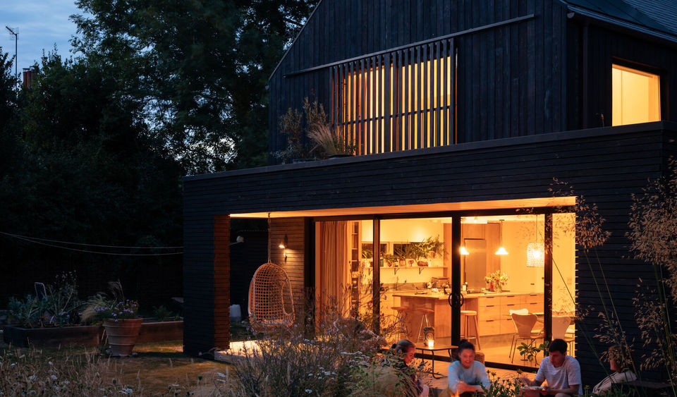 The Black Timber House, designed by HAPA Architects, is a contemporary eco-home located on the edge of the village of Rodmell, within the South Downs National Park in East Sussex, England. Completed in 2022, the award-winning residence is situated in a bucolic context, replacing a mid-century bungalow that had a less harmonious relationship with the landscape. The design is a sensitive and modern response to its setting, nestled among ash trees and fields, with its dark timber exterior allowing it to recede softly into the scenery. The house was conceived with a strong focus on sustainability, with the goal of creating a home that respects its surroundings and has minimal energy consumption. HAPA Architects employed a range of passive and active strategies to achieve this. Key features include an A-rated Energy Performance Certificate (EPC), high levels of insulation and air tightness, and a passive solar design. The house also generates its own power via photovoltaic (PV) panels on the roof and uses a high-efficiency air source heat pump for low-temperature underfloor heating. A mechanical ventilation with heat recovery (MVHR) system ensures a constant supply of fresh air, contributing to a stable and calm internal atmosphere regardless of external weather conditions. The architectural design features two distinct stacked forms, which create interesting overhangs and roof spaces. The lower level is built on a concrete plinth, while the upper, private bedroom spaces are housed within a simple gabled form that reaches up into the canopies of the trees. The transition from horizontal timber cladding on the lower level to vertical timber on the upper level accentuates this distinction. A covered entrance and a raised, open veranda connect the house to the rear garden and fields. Inside, the vaulted ceilings of the bedrooms create impressive double-height spaces, and a wrap-over window adds dramatic natural light. The interior continues the minimalist and elegant aesthetic with natural materials. The kitchen features bespoke cabinetry crafted from cross-sawn, smoked, and white-oiled engineered oak planks, a material that also serves as the timber flooring. This provides a rustic yet refined texture that complements the home's contemporary feel. A natural patinaed zinc worktop works beautifully with the other natural finishes. Credits Architecture and Design: HAPA Architects (Stuart Paine, Director) Photography: Jim Stevenson Timber Flooring and Bespoke Cabinetry: Chaunceys Timber Flooring Location: Rodmell, Lewes, East Sussex, UK Clients: Louise and her partner