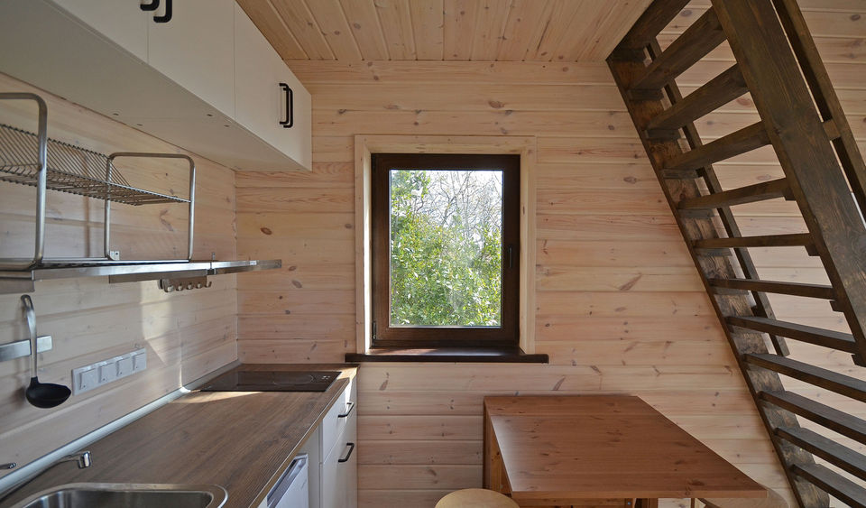 The Ecohouse Module S22, designed by Ilya Shevchenko for the architectural bureau Strawmodul, is a prefabricated and modular tiny house series focused on eco-friendly, sustainable living. The project was developed as a "growing" home, allowing for phased construction and future expansion from the initial 22-square-meter module to a larger residence of up to 100 square meters. The initial prototype, completed in 2019, is situated on the rocky coast of Crimea. The core of the Ecohouse S22's sustainability is its unique construction method, which uses prefabricated straw panels. These panels are made from compressed straw bales set within a strong wooden frame. This method allows the house kit to be delivered in pieces and erected quickly, typically within two to three days. The use of straw as insulation provides excellent thermal properties, exceeding the heat-insulating performance of traditional wood or brick walls and aligning with European passive house standards for minimal heat loss. As straw is a renewable natural resource, this construction method is eco-friendly, utilizes what would otherwise be considered agricultural waste, and generates minimal construction waste. The design of the Crimea prototype features a strong, cantilevered terrace that projects from the dense vegetation, offering elevated views of the coast and surrounding mountains. To protect against prying eyes, the main facade with its wide window is hidden from passersby. Inside, the two-story module is compactly arranged, with a hallway and bathroom on the first floor and a quieter bedroom area on the second. The house is also equipped with solar panels, designed to provide a significant portion of its energy needs. Credits Architect: Ilya Shevchenko Architecture Firm: Strawmodul Photography: Ilya Shevchenko