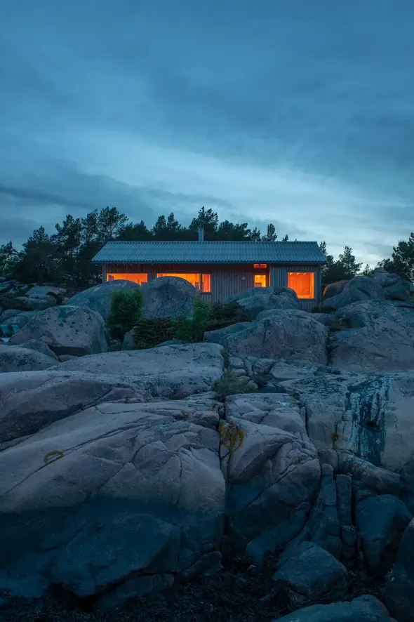 Situated on the rocky shoreline of Ny-Hellesund, Norway, the Krabbebu Cabin is a simple yet thoughtfully designed holiday retreat that harmonizes with its rugged coastal landscape. Completed in 2022, the 47-square-meter cabin was designed by Oslo-based firm KIMA Arkitektur in collaboration with the owners, an internationally acclaimed furniture and product designer couple. Inspired by the aesthetic of local fishing huts, the cabin's minimal and modest silhouette is strategically placed among rocky outcrops to provide shelter from the elements. To maximize the small footprint for a family of five, the interior features an open-plan living room and kitchen, a bedroom, and a bathroom. The interior design, overseen by the client, incorporates custom-built kitchen furnishings to suit the compact space. The inside is clad entirely in pine wood, creating a warm, camp-like atmosphere that emphasizes the structure's materiality. The cabin is oriented toward the sea, with large windows providing expansive views of the water. A small outdoor deck and jetty further connect the residents with their surroundings, allowing for easy access to the water and coastal landscape. The exterior is also clad in pine wood, helping the cabin blend seamlessly into the Norwegian shore. The structure was built by local craftspeople, ensuring it reflects the regional building traditions. Credits Architects: KIMA Arkitektur Clients: Andreas Engesvik and Jannicke Grung Kitchen & Interior: Hamran Kitchen & Interior Windows: Meling Photography: Ivar Kvaal, Hest Agentur