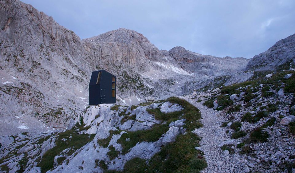 "Nestled on a high mountain plateau at 2,080 meters above sea level in Slovenia's Kamnik Alps, the Bivouac Under Grintovec, also known as the Pavle Kemperle Shelter, is a three-story minimalist shelter designed by architect Miha Kajzelj. Built in 2009 to replace an older, deteriorating bivouac, the new structure serves as a free refuge for mountaineers navigating the rugged landscape of Veliki podi beneath Mount Grintovec. Its vertical form is intended to be a highly visible landmark, easily spotted by hikers against the rock in summer or snow in winter. The shelter's design was heavily influenced by the extreme alpine environment and the logistical challenges of building at such a remote site, accessible only by foot. The components of the bivouac were prefabricated for minimal weight and transported to the site by helicopter. It rests on a small concrete base anchored into the bedrock, minimizing its footprint on the landscape. The structure is a simple volume, measuring 2 by 3 meters with a height of 4.5 meters. The exterior is clad in black aluminum panels, which contribute to its striking appearance against the backdrop of the mountains. The interior, with a total floor area of 14 square meters, is arranged across three vertical levels connected by a ladder. Large, vertical windows are strategically placed at the corners to frame dramatic views of the surrounding peaks, giving the impression that the upper sleeping levels are ""floating"" above the mountain scenery. The bivouac is unheated but designed for energy efficiency. The aluminum outer panels provide insulation to retain the heat generated by the occupants' bodies, while the inner skin of perforated wooden panels allows moisture to escape, ensuring a dry and warm interior. The vertical layout means that heat naturally rises to the upper sleeping levels, which can comfortably accommodate up to eight people. The ground floor provides a living and dining area with benches and a small table. The successful realization of the bivouac earned Miha Kajzelj the Plečnik Medal in 2011. Project credits Architecture: Miha Kajzelj Photography: Matevž Paternoster Client: Gorska reševalna služba Kamnik (Kamnik Mountain Rescue Service) Original Structure: Built in 1973 by the Kamnik Mountain Rescue Service"