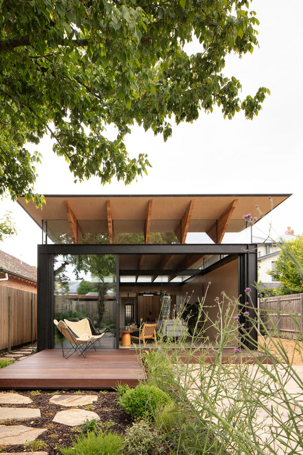 "Lyons House by Moloney Architects is a contemporary renovation and addition to an existing Federation-era home in central Ballarat, Victoria. Designed for a downsizing couple, the project transforms the formerly dark and disconnected house into a light-filled, energy-efficient home with a strong connection to its garden. The design balances respect for the original home's architectural character with the requirements of modern, accessible living. The design strategy clearly contrasts the new and old by distinguishing between the original double-story home and a low, horizontal extension. The new addition is defined by a shallow, floating roof and is linked to the existing house via a narrow hallway flanked by courtyards. These courtyards pull natural light into the original structure's rooms, which had previously been dark. The interior of the extension features a minimalist material palette of black steel, exposed timber beams, and plywood. This combination creates a sense of warmth and texture while emphasizing the contrast with the exposed structure. The timber, specifically Tasmanian Oak for the beams and Maxi Panel Baltic Birch plywood for the ceilings and walls, adds natural warmth and connects the indoor and outdoor spaces. Large windows and a halo of high-level windows separate the roof from the walls, allowing low winter sun to penetrate deep into the space and warm the polished concrete floors. The roof overhangs are strategically designed to block the summer sun, ensuring thermal comfort year-round. To accommodate the clients' request for a ground-floor bedroom as they downsize, the architects repurposed the original living room into a main bedroom, ensuite, and walk-in robe. Upstairs bedrooms were retained for visiting family and friends. Project credits Architecture: Moloney Architects Builder: Hayden Bromley Building Styling: Hilgar Design Photography: Ben Hosking"
