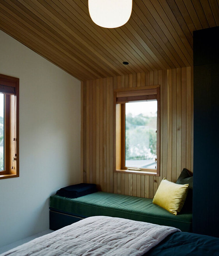 "Designed by Wellington-based Patchwork Architecture, the Fontbunker is a small, two-level building that functions as both a creative workspace and a guest retreat on a compact urban property. Created for Kris and Jess Sowersby, the owners of the Klim Type Foundry, the project was a unique expansion that deliberately separates the work and leisure zones from the main home. The design is a clever, vertically organized response to the limited space, with each level having a distinct character. The lower-level workspace, referred to as the ""Fontbunker,"" is partially submerged into the ground and enclosed by an in-situ board-form concrete exterior. The interior of the studio is a focused and calm environment, with windows carefully positioned to allow ample natural light while minimizing glare on the client's extensive book collection. Here, rimu cabinetry floats above a parquet floor, and a large pivoting glass door opens to a small garden space, connecting the interior with the landscape. The upper-level guest accommodation, accessible via an external cantilevered concrete staircase, is a lighter, warmer space. It is clad in black anodized aluminum, which contrasts with the raw concrete of the lower level. Inside, soft and warm materials create a serene atmosphere, with wool carpet, cedar wall and ceiling linings, and leathered stone. The material palette, featuring stone, brass, and timber, visually links the two levels, creating a cohesive building despite their differing functions. Throughout, exquisite craftsmanship and attention to detail, including custom bronze fittings by local artist Ben Pearce, imbue the project with a sense of quality and quiet refuge. Project credits Architecture: Patchwork Architecture Build: Dorset Construction Landscape Design: Local Landscape Architecture Collective Artwork (Bronze Fittings): Ben Pearce Photography: Mary Gaudin"