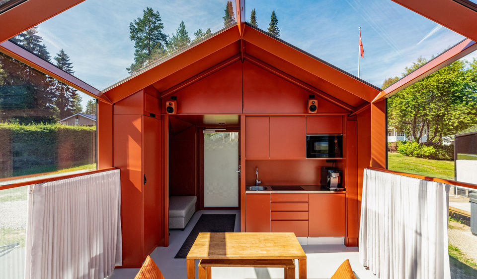 "The Lucia Smart Cabin is a 24-square-meter glass-and-steel modular unit designed in 2019 by Finnish firm Pirinen Salo Oy for the glass construction company Savon Lasituote Oy. Conceived as a high-quality ""hideout"" or experiential space, the cabin was created to offer occupants uninterrupted, panoramic views of the surrounding landscape, including the sky. The initial prototype was installed in Inari, Finland, near Juutuanvuono Lake, with an almost 360-degree vista of the riverside site. A core principle of the design is seamless integration with nature. This is achieved through its mirrored glass exterior, which reflects the environment and makes the cabin appear to blend in with the trees. The sleek black steel frame and floor ribbon also minimize the visual impact on the landscape. The interior is designed to draw attention outwards, with uniform colors and materials that do not distract from the external view. The triangular shape of the steel beam structure and the angle of the glass surfaces are precisely calculated to optimize sightlines, especially for someone lying in bed. High performance in challenging climates is a key feature of the Lucia Smart Cabin. The structure uses high-tech thermal glass, tested to withstand frigid temperatures, and includes an integrated heated floor system. Integrated lighting within the steel frame illuminates the interior without cluttering the glass and uses the surfaces to create a dynamic, multi-dimensional effect. For privacy or cooling, options such as curtains or customized prints can be added to the glass. The units are prefabricated and delivered to the site ready for installation on foundations with infrastructure connections. The compact but efficient interior accommodates a king-size bed, a small kitchenette, a dining area, and a bathroom. An exterior patio and a path to the water's edge extend the experience to the outdoors. Credits Architects: Pirinen Salo Oy (Teemu Pirinen, Lauri Salo) Manufacturer: Savon Lasituote Oy (Kai Nikula, Jani Leinonen, Kari-Matti Ruhanen) Construction Engineer: Hannu Nivalainen of Ylä-Savon Rakennesuunnittelu Ky Constructor: Meserak Oy (Pekka Repo, Hannu Komulainen, Toni Komulainen) Landscape Architects: VSU Maisema-arkkitehdit Oy (Outi Palosaari, Saara Oilinki, Katri Nuutinen) Photography: Marc Goodwin HVAC: Sami Säisä of Hanakat Iisalmen Putkiasennus Oy Electrical Engineering and Implementation: Mikko Murtola of Iisalmen Sähkö- ja automaatiosuunnittelu Oy Carpentry and Fixtures: Juha Huttunen with Miikka Bär from Vahtituvan puusepänverstas and B Design Oy Fireplace and Chimney: Sydänmuuraus Oy Interior Design (Red Cabin): Lomallo Consultants: RP-Teollisuuspalvelu Modular Building Solutions and Materials: Sika Finland (various Sika products)"