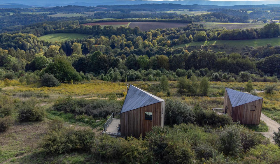 "The Small Vacation Cottages u Gai are a pair of small summer houses located on a steep hillside in Radomice, Poland, with panoramic views of the Karkonosze Mountains. Designed by Polish firm SAN Architektura, the project was inspired by a nearby closed quarry and a desire to reflect the natural landscape. The cottages are designed to look like freely scattered, hewn boulders on the slope, with plans for a third, larger building—a single-family home for the owners—to be added in the future. The design of the 81-square-meter cottages is both simple and strategic. Built on square plans, they feature a ground-floor living area with a kitchenette, a bathroom, and a dressing room. A mezzanine bedroom on a diagonal to the main floor is aligned with the roofline to create a sense of height and maximize usable space. The interiors emphasize the views, with large, 4.5-meter-wide panoramic windows framing the mountain landscape. The construction and materials were chosen to harmonize with the wild surroundings. The structures were built using the HBE glued timber system, eliminating the need for additional interior wall finishes. The exterior is clad in Siberian larch, which was left untreated to allow it to patinate naturally under the sun's UV rays, helping the cottages blend into the landscape. The base of each cottage is finished with hewn stone, referencing the nearby quarry and grounding the structures to the site. The cottages are slightly elevated from their stone plinths, creating the impression that they are levitating over the slope. This design choice not only enhances the visual effect but also brings occupants closer to the surrounding nature, as bushes seen from the living room resemble treetops. To preserve the natural, wild character of the plot, the architects opted for unpaved paths using aggregate from the local area and avoided adding fences. Credits Architect: SAN Architektura Lead Architect: Rafał Oleksik Photography: Michał Drapała Construction: AM Projekty Konstrukcje HVAC Engineers: Michał Baran Embe Studio Electrical Engineer: Paweł Kóska Manufacturers: Dombal, Konsbud, Novobudowa"