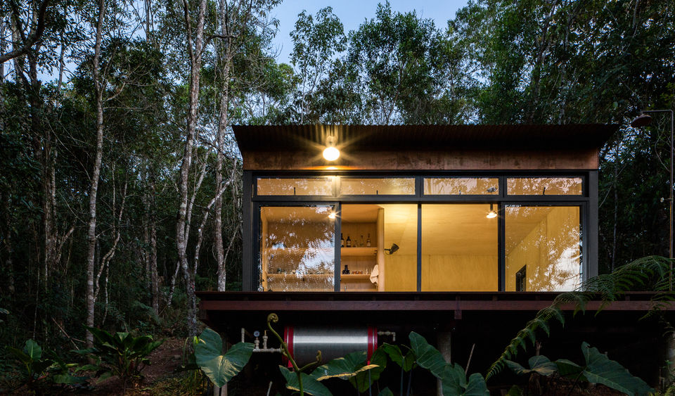 "Completed in 2018, Chalet M is a tiny, minimalist cabin designed by São Paulo-based architect Silvia Acar Arquitetura for a secluded woodland site in São Lourenço da Serra, Brazil. The 270-square-foot structure was created as a peaceful retreat for its owners to reconnect with nature. Due to the challenging, remote terrain and lack of vehicle access, all building materials were selected to be lightweight and were carried to the site by hand, ensuring the cabin has a minimal impact on the environment. The cabin was elevated off the ground on six cylindrical concrete columns, allowing it to rest lightly on the forest floor. The exterior is comprised of a massive hardwood structure covered with OSB plywood, a Tyvek air and water barrier, and corrugated metal sheets for the outer layer. Its dark exterior helps the structure blend seamlessly into the lush surrounding forest. A floor-to-ceiling glass facade is the focal point of the design and includes sliding glass panels that open onto a wooden deck. This feature visually and physically connects the interior with the landscape, which includes a lake and mountain views. Inside, the cabin's material palette consists of thermoacoustic insulation and light-toned paricá plywood for the walls, ceiling, and built-in furniture. A prefabricated fiberglass box base anchors the sleeping and storage area. The custom-built furnishings and compact design provide a cohesive, multifunctional space for sleeping, cooking, and simply enjoying the natural surroundings. Credits Architect: Silvia Acar Arquitetura Photography: André Scarpa Manufacturer: Indusparquet"