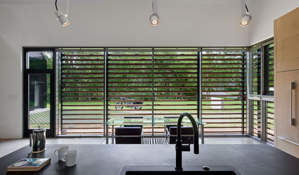 "Located in Lawrence, Kansas, the Pinkney Neighborhood House was designed and built by graduate students at the University of Kansas's Studio 804 in 2023. This sustainable infill project, situated on the former site of a demolished home on Indiana Street, showcases modern design while adhering to the scale and vernacular of the historic neighborhood with its gabled roof forms. The house is Studio 804's 18th project to achieve LEED Platinum certification, the highest level of sustainable practice. The project features a main house and an accessory dwelling unit (ADU) above a detached, one-car garage, which promotes urban density and provides rental income opportunities for the owner. The design prioritizes a connection to the environment, particularly the backyard, which is adjacent to a flood zone and feels like a secluded, forested retreat. Inside the main house, an open-plan living, kitchen, and dining area offers flexibility for the occupants. The interior features low-VOC finishes, and a combination of louvers and operable windows ensures passive heating and cooling, while an energy recovery ventilator manages fresh air circulation in the airtight building envelope. The exterior is clad in Nichiha's glossy black Miraia architectural wall panels, giving it a modern and sleek appearance. Sustainability measures include a rainscreen ventilated facade, a 16-panel solar array, a permeable driveway to minimize stormwater runoff, and a rain garden on the eastern side of the property. The house also has energy-efficient windows and doors, Energy Star-rated appliances, and wiring for an electric car charger in the garage. Credits Architect and builder: Studio 804, Dan Rockhill Student designers: Lydia Juengling Photographer: Corey Gaffer Manufacturers and suppliers: S-5! Metal Roof Attachments, Nichiha, Duravit"
