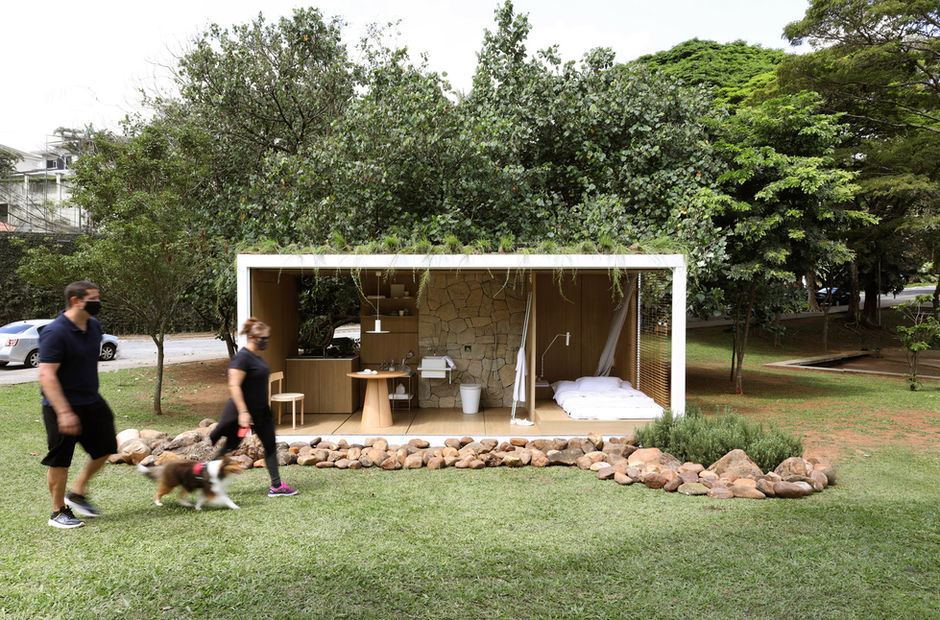 "Elo Studio is a compact, 15-square-meter container home designed by the São Paulo-based architecture and interior practice Ticiane Lima Arquitetura & Interiores. Completed in 2020 as a prototype for the Janelas CASACOR 2020 exhibition, the project was conceived as a response to the post-pandemic context, reflecting on how living spaces could be rethought for well-being. It was inspired by the artwork ""elo"" by Ricardo Bueno, which joins brass and delicate blown glass, and the studio sought to emulate the artwork's concept of inhabiting a fragile yet supportive space. The prototype was showcased in a landscape setting in São Paulo, featuring large window openings that connect the minimalist interior with nature. The design incorporates Scandinavian influences, utilizing light-toned wood and focusing on multifunctional spaces. To maximize the small area, the interior includes a kitchen, an office, a bedroom, and a bathroom, with distinct areas created through wooden screens and contrasting materials. The house also emphasizes sustainability, featuring a green roof designed by landscaper Flávio Abílio and a solar panel system for energy. Credits Architects: Ticiane Lima Arquitetura & Interiores Landscaper: Flávio Abílio"