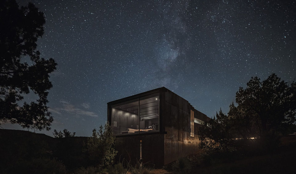 "Completed in 2023, the 1600-square-foot Telescope House is a retreat in the high-desert landscape of Sedona, Arizona, designed by Phoenix-based Wendell Burnette Architects. The house was commissioned by clients who, after visiting the area for decades, wanted a low-impact home that would serve as a seasonal retreat, a short-term rental, and eventually, their full-time residence. The house's design is inspired by the metaphor of a ""land-based telescope"" that frames specific views of the dramatic desert landscape. Situated on a gently sloping site on the footprint of a former building, the house is intentionally understated. The rectangular form is nestled between two rows of centuries-old Juniper trees that frame views of the iconic Cathedral Rock and Munds Mountain. Clad in weathering Corten steel and with steel-plate window frames, the exterior helps the building recede into the landscape like a ""dark shadow,"" particularly at night, and offers excellent fire resistance. The interiors are designed as a ""welcome respite for the eyes in the desert,"" with a minimalist, dark-toned palette. The floors, walls, ceilings, doors, and cabinets are crafted from FSC-certified recycled wood-dust panels impregnated with a dark pigment, then waxed and buffed. A telescopic central hall, with interior surfaces that step up and out, subtly directs attention toward the panoramic east-facing view. This layout connects the more private, cabinet-like bedroom and bathroom areas on the south to the main living, kitchen, and dining spaces at the east end. The house also incorporates sustainable features, including strategically shaded windows for passive solar heating in the winter, operable windows for cross ventilation, and the potential for a future photovoltaic array. A planned water-harvesting tank will further increase the home's self-sufficiency. Credits Architects: Wendell Burnette Architects (Wendell Burnette, Brandan Siebrecht, Jared Abraham, and Joby Dutton) Clients: Ian and Anne Nowland Photography: Jason Roehner General Contractor & Custom Fabrication: Roots Design Build (Mark McCulloch) Structural Engineer: Rudow + Berry, Inc Electrical Engineer: Woodward Engineering Mechanical Consulting: EKR Heating and Cooling Lighting Design: Creative Designs in Lighting Millwork: CMCW (Chris Madsen) Miscellaneous Steel: Falcon Steel (Scott Dow) Facade Consulting: Tryland Homes (Robert Densmore) Signage & Artworks: Arpark Signs (Gretchen Wilde) Landscape Contractor: Arterra Inc Home Automation & Media: Technically Integrated (Jared Payne) Rendering & Visualization: 5visual"