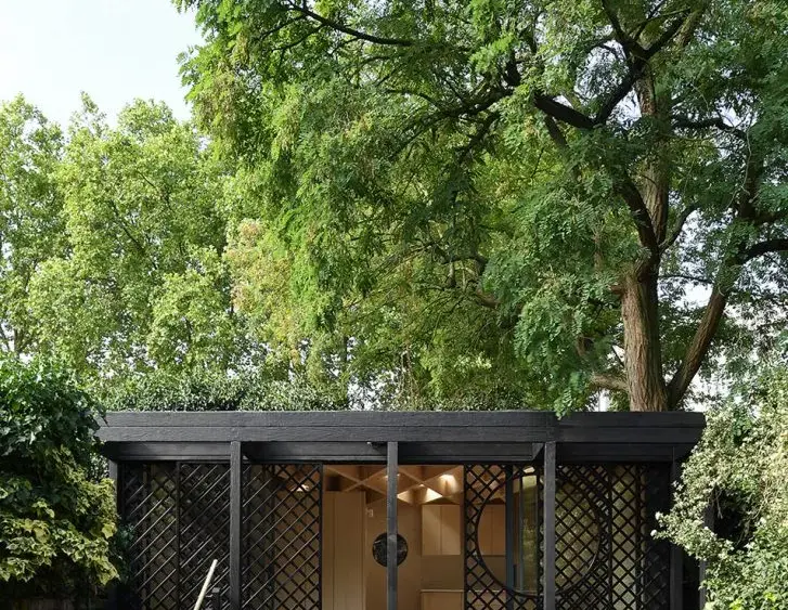 "Completed in 2024, the Garden Room by Wilkinson King Architects is a detached, 24-square-meter private annex located in the garden of a Grade II listed Victorian house in Stockwell, south London. The project was commissioned by the client to provide a home for their mother who had moved to the city to be near family. Built on the site of a former raised terrace, the new structure is designed to harmonize with its garden setting. The design is sensitive to its surroundings, particularly the large tree canopy that provides protection for the small building. The exterior is clad in charred timber (shou sugi ban), which takes on the dark tones of its environment and provides protection from the elements. The form is characterized by a rectilinear elevation contrasted by a large, circular, moon-like opening. A pergola structure acts as an intermediate threshold between the shared garden and the interior. This space can be screened for privacy by sliding lattice panels that mask the full-width glazing. The interior of the single-room space is designed to feel bright and open. Birch plywood wall linings give a soft, warm feel, while Douglas fir flooring provides an organic texture. The roof features exposed diagonal joists, reminiscent of tree branches, and circular skylights cast dappled light onto the floor and provide views of the tree canopy above. A full-height cupboard divides the space to create a separate shower room while maintaining visual continuity of the ceiling. The highly sustainable design features excellent insulation, electric underfloor heating, and natural light and ventilation. The dry-construction technology is fully reversible, as the structure is built on small screw piles that can be easily removed. Credits Architects: Wilkinson King Architects Structural Engineer: Structure Haus M&E: Lamorbey Associates Principal Designer & CDM: Wilkinson King Approved Building Inspector: Integral BCS Main Contractor: 3 Build Construction Photography: David Grandorge"