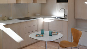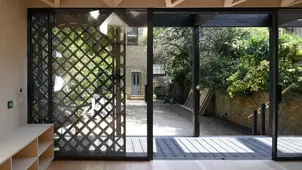 Completed in 2024, the Garden Room by Wilkinson King Architects is a detached, 24-square-meter private annex located in the garden of a Grade II listed Victorian house in Stockwell, south London. The project was commissioned by the client to provide a home for their mother who had moved to the city to be near family. Built on the site of a former raised terrace, the new structure is designed to harmonize with its garden setting. The design is sensitive to its surroundings, particularly the large tree canopy that provides protection for the small building. The exterior is clad in charred timber (shou sugi ban), which takes on the dark tones of its environment and provides protection from the elements. The form is characterized by a rectilinear elevation contrasted by a large, circular, moon-like opening. A pergola structure acts as an intermediate threshold between the shared garden and the interior. This space can be screened for privacy by sliding lattice panels that mask the full-width glazing. The interior of the single-room space is designed to feel bright and open. Birch plywood wall linings give a soft, warm feel, while Douglas fir flooring provides an organic texture. The roof features exposed diagonal joists, reminiscent of tree branches, and circular skylights cast dappled light onto the floor and provide views of the tree canopy above. A full-height cupboard divides the space to create a separate shower room while maintaining visual continuity of the ceiling. The highly sustainable design features excellent insulation, electric underfloor heating, and natural light and ventilation. The dry-construction technology is fully reversible, as the structure is built on small screw piles that can be easily removed. Credits Architects: Wilkinson King Architects Structural Engineer: Structure Haus M&E: Lamorbey Associates Principal Designer & CDM: Wilkinson King Approved Building Inspector: Integral BCS Main Contractor: 3 Build Construction Photography: David Grandorge