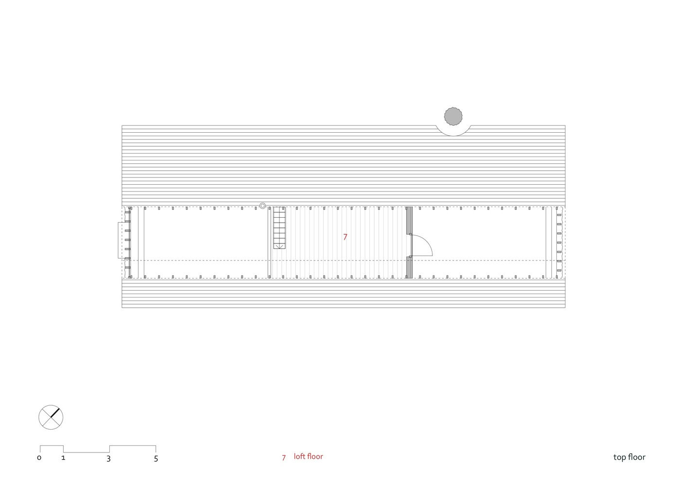 The barn itself is a blend of rustic and modern aesthetics, incorporating a minimal palette of natural materials: oak, concrete, and glass. Inside, the exposed timber frame is paired with board-formed concrete walls, creating surfaces with unique patterns left by the sapwood used for the forms. Large glass panels and slatted windows allow light to flood into the interior. The 1,300-square-foot structure is divided into three main areas: a carport, a storage room, and a workshop that doubles as a meeting space for the firm. Above the storage room is an open loft space that overlooks the workshop area.