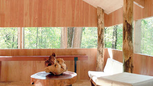 Inspired by the historic Château while designed for contemporary life, the house is a single, monolithic volume wrapped in thick, weather-resistant wood that contrasts with the smooth, lighter finish of its interior. A fluid internal space is arranged around a central core, with an "interior topography" of varied heights creating distinct functional zones and offering a variety of possible spatial configurations. The interior features a ramp that doubles as a sofa, and different levels for sitting, cooking, and sleeping help to maximize the compact footprint. A covered terrace is located under the higher-level sleeping area.