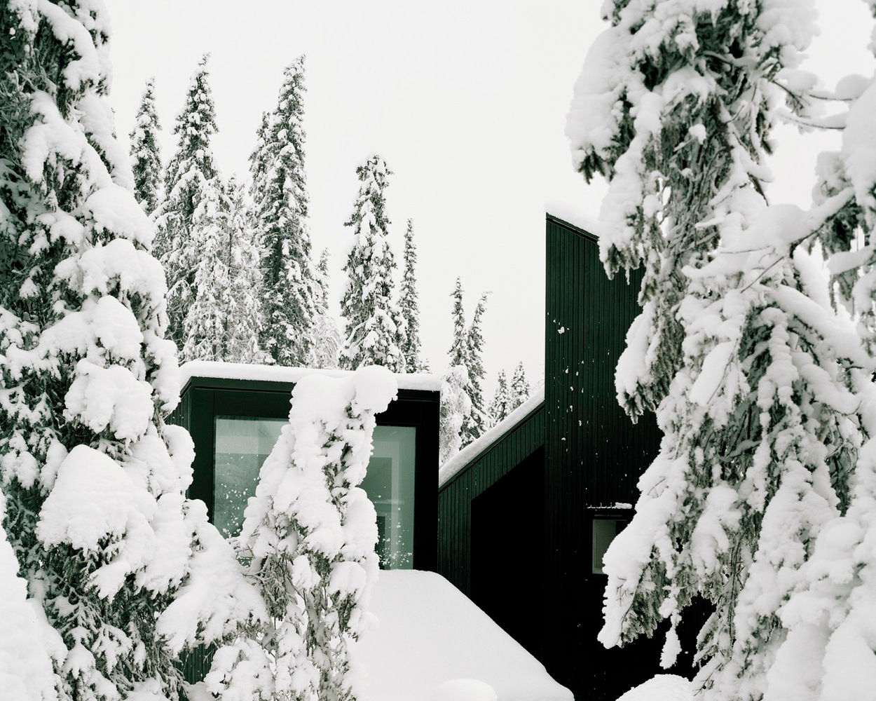 Designed by Oslo-based Vardehaugen Architects and led by Håkon Matre Aasarød, Cabin Vindheim is a 55-square-meter retreat in the alpine landscape near Lillehammer, Norway, and was completed in 2016 for a private client. The cabin draws inspiration from the classic image of snowbound cabins, where only the roof protrudes through the snow, and blends into its surroundings with deep gables that extend to the ground. The structure's angular shape and black-stained pinewood cladding contrast with the dramatic white winter landscape. The interior, which is spacious despite its compact size, is clad in a waxed poplar veneer, with uplifts in the sloped ceiling creating a rich spatial experience. An uninterrupted ceiling connects the living room, bedroom, ski room, and a small utility annex. A large, 4-meter-long window in the bedroom offers views of the treetops and night sky, enhancing the feeling of sleeping within nature. The off-grid cabin relies on solar power and a wood oven for energy. A unique and playful feature is the cabin's roof, which doubles as a ski slope or toboggan run during the snowy winters. Credits Architects: Håkon Matre Aasarød, Berta Gaztelu, Joana Branco, and Kurt Breitenstein of Vardehaugen Architects Photography: Rasmus Norlander, Einar Elton