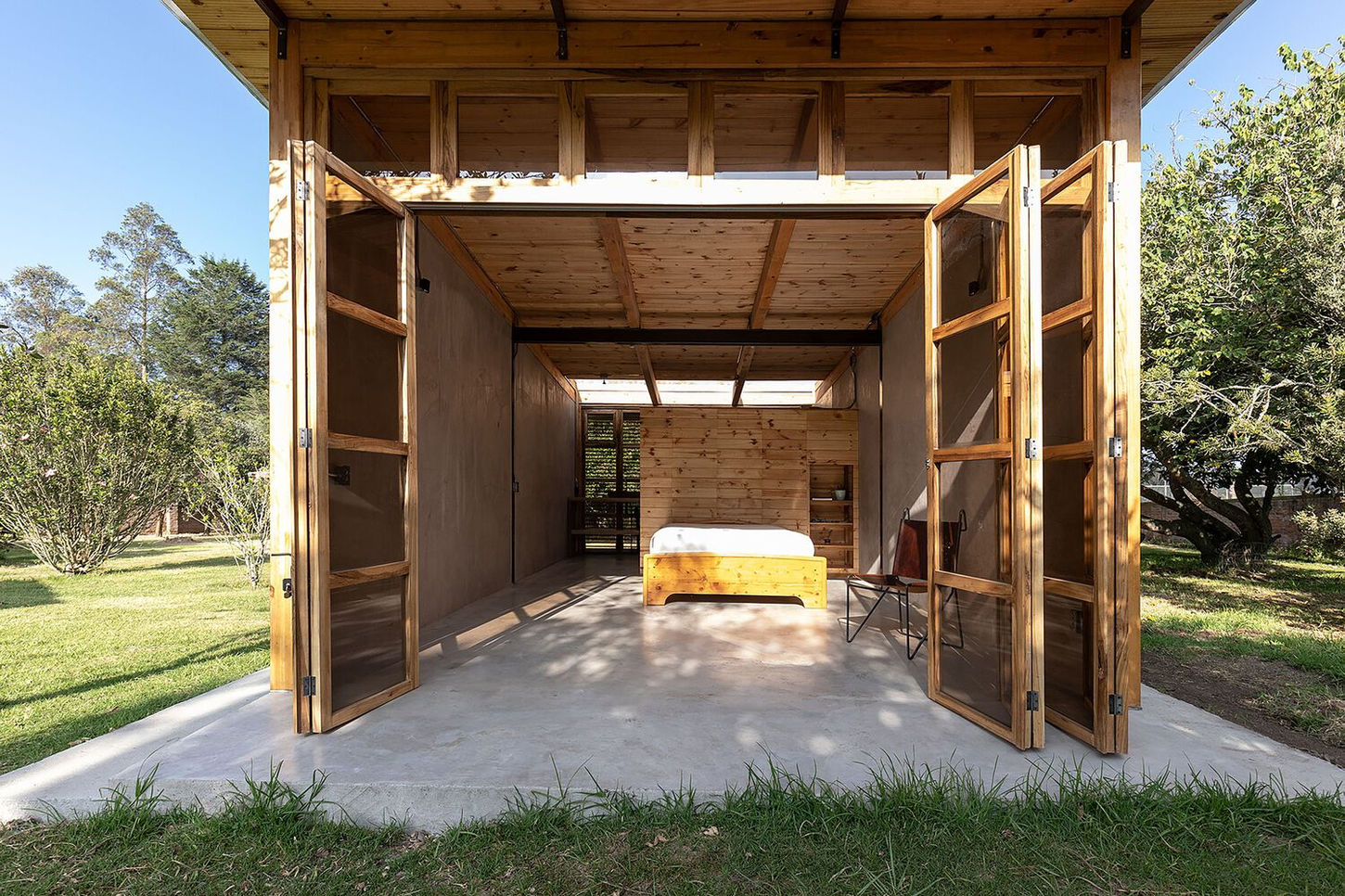 Constructed with wood and a traditional Latin American technique called bahareque, which uses earth, straw, and wood, the cabin was designed with the intention of reclaiming local construction practices. This approach not only strengthens its connection to the land but also optimizes resources through material experimentation. The building is clad in small wooden panels, which give the structure a simple and timeless aesthetic. A central outdoor space and an elevated platform for the cabin allow it to connect seamlessly with the landscape and offer peaceful views of the lush green fields.