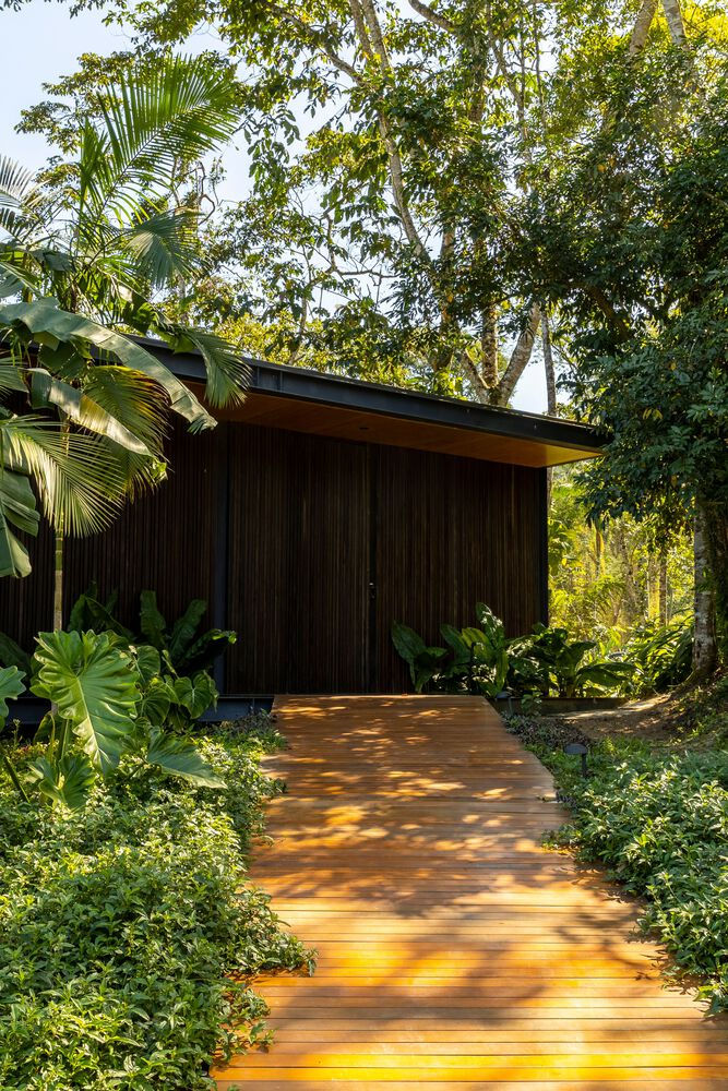 The Jaguatirica Cabin, designed by Pitta Arquitetura and completed in 2021, is a minimalist and sustainable 65-square-meter retreat located in the Atlantic Forest of Ubatuba, Brazil. Situated within a vast forest reserve, the cabin was conceived as a "cocoon" to allow guests a serene and intimate connection with the lush, biodiverse natural surroundings. The design is a testament to low-impact construction, blending architectural form with the untouched landscape. To minimize its environmental footprint, the project utilized a lightweight, dry construction system that allowed for rapid assembly and produced very little material waste. The structure features a metal frame with wood-frame panels and a waterproof thermoplastic cover, all chosen to respect the natural topography of the site. Natural materials like wood, glass, and exposed concrete were selected to create a welcoming atmosphere that integrates seamlessly with the forest setting. The cabin's elevated position further reduces its impact on the ground. The cabin’s architecture is defined by its focus on natural light and expansive views of the forest. Large openings and sliding glass doors on the main facade invite the surrounding nature inside, creating an immersive, well-ventilated living space. A prominent 2.5-meter eave extends from the roof, providing shade from the sun and shelter from rain while still allowing ample natural light to enter. The interior is organized as a single, open-plan space that integrates the living room, bedroom, and kitchen without partitions, which enhances the feeling of spaciousness and reinforces the connection to the outdoors. Credits Architects: Pitta Arquitetura (Thiago Brunini Pitta, Rodrigo Alves Pereira) Landscape: Paisagismo Plantare Photography: João Paulo Soares de Oliveira Client: Fazenda Ressaca Manufacturers: Bio empreendimentos, Estruturas do vale, Marcenaria G.M, Mundo das Pedras, Pau Pau Pisos em Madeira