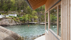 Situated on the rocky shoreline of Ny-Hellesund, Norway, the Krabbebu Cabin is a simple yet thoughtfully designed holiday retreat that harmonizes with its rugged coastal landscape. Completed in 2022, the 47-square-meter cabin was designed by Oslo-based firm KIMA Arkitektur in collaboration with the owners, an internationally acclaimed furniture and product designer couple. Inspired by the aesthetic of local fishing huts, the cabin's minimal and modest silhouette is strategically placed among rocky outcrops to provide shelter from the elements. To maximize the small footprint for a family of five, the interior features an open-plan living room and kitchen, a bedroom, and a bathroom. The interior design, overseen by the client, incorporates custom-built kitchen furnishings to suit the compact space. The inside is clad entirely in pine wood, creating a warm, camp-like atmosphere that emphasizes the structure's materiality. The cabin is oriented toward the sea, with large windows providing expansive views of the water. A small outdoor deck and jetty further connect the residents with their surroundings, allowing for easy access to the water and coastal landscape. The exterior is also clad in pine wood, helping the cabin blend seamlessly into the Norwegian shore. The structure was built by local craftspeople, ensuring it reflects the regional building traditions. Credits Architects: KIMA Arkitektur Clients: Andreas Engesvik and Jannicke Grung Kitchen & Interior: Hamran Kitchen & Interior Windows: Meling Photography: Ivar Kvaal, Hest Agentur