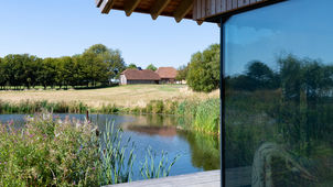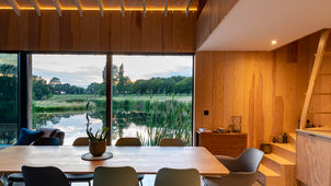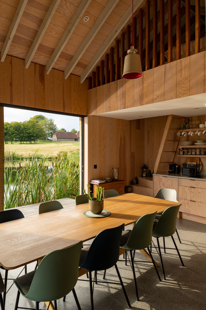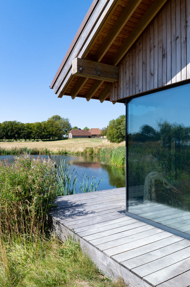 The Lake Cabin is a modern retreat located on the edge of a lake in Brabourne, within the Kent Downs Area of Outstanding Natural Beauty in South East England. Designed by RX Architects, the cabin is approached on foot via a woodland trail, as it is not accessible by vehicles. The project reflects a "sense of place," using natural materials to create a strong visual connection between the structure and its rural environment. The 35-square-meter cabin is designed with an exposed timber frame and features two full glazed elevations that angle out toward the water. These sliding glass walls open up to a cantilevered deck that hovers over the water, providing seamless access for activities like swimming and kayaking. The building is clad in a mix of rough-sawn and planed English oak planks, which are left unfinished to weather naturally over time and integrate further with the landscape. A concrete base acts as a datum line, stepping up to form a bench and log store. The roof and its trims are clad in a contrasting patinated bronze finish. Inside, the cabin features a restrained, open-plan layout with a garden room, kitchen, and a wet room on the main level. Wide-format Douglas Fir boards line the interior walls, adding to the cabin's natural, rustic feel. A mezzanine level provides a sleeping area. The entire design is oriented toward maximizing views of the lake and surrounding countryside. Credits Architects: RX Architects Lead Architects: Rob Pollard Photography: Ashley Gendek Consultants: Chartwood Joinery Contractor: Coastview Property Ltd Engineering: Price & Myers Landscape: Marian Boswall Landscape Architects