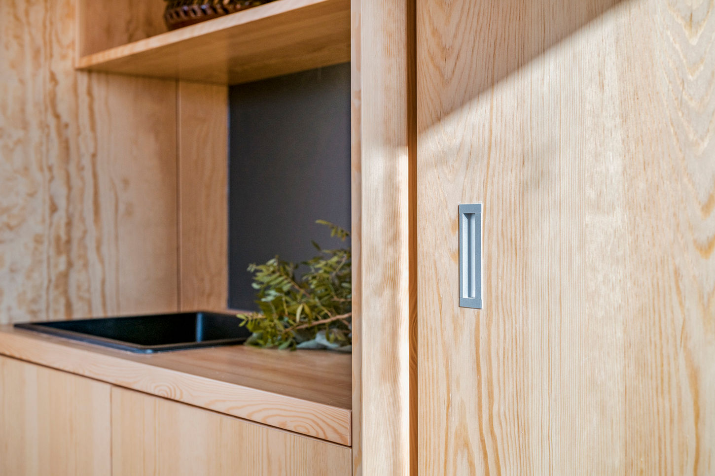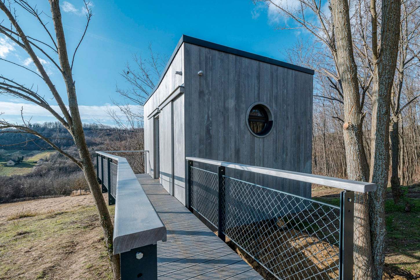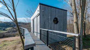The Wauhaus Cabin is a minimalist, 20-square-meter retreat designed and built by the Hungarian studio Hello Wood. Completed in 2021, the cabin is situated on a steep hillside in the Zala County hills of Hungary, appearing to float above the ground on stilts of varying lengths. The playful design, inspired by treehouses, offers a new perspective on the surrounding landscape and functions as a guest house, study, or glamping accommodation. The exterior is clad in graphite gray larch planking, creating a contemporary, clean look that contrasts with the warm interior. A narrow bridge provides access to the entrance, where it widens to form a small terrace. Inside, the space is completely covered in natural birch plywood, with oak flooring, creating a cozy and inviting atmosphere. A key feature is the large, floor-to-ceiling window at one end, which acts as a "fourth wall" and allows the landscape to define the mood of the interior by projecting different colors and light throughout the seasons. Additional round windows add a playful element to the design. Despite its compact size, the Wauhaus features a small kitchenette, and sliding birch plywood doors conceal the bathroom and cabinet, maximizing the use of the limited space. True to Hello Wood's focus on sustainable and durable construction, the cabin is built with eco-friendly materials and is designed for all-season use, promising to last for decades. Credits Designed & Built by: Hello Wood Design Board: András Huszár, Péter Pozsár, Dávid Ráday, Krisztián Tóth Concept: András Huszár, Dániel Kiss, Gergely Szőke Chief Architect: Péter Pozsár Project Architect: Bertalan Balku, Tamás Fülöp Architect: Tibor Pálóczi Photography: Máté Lakos