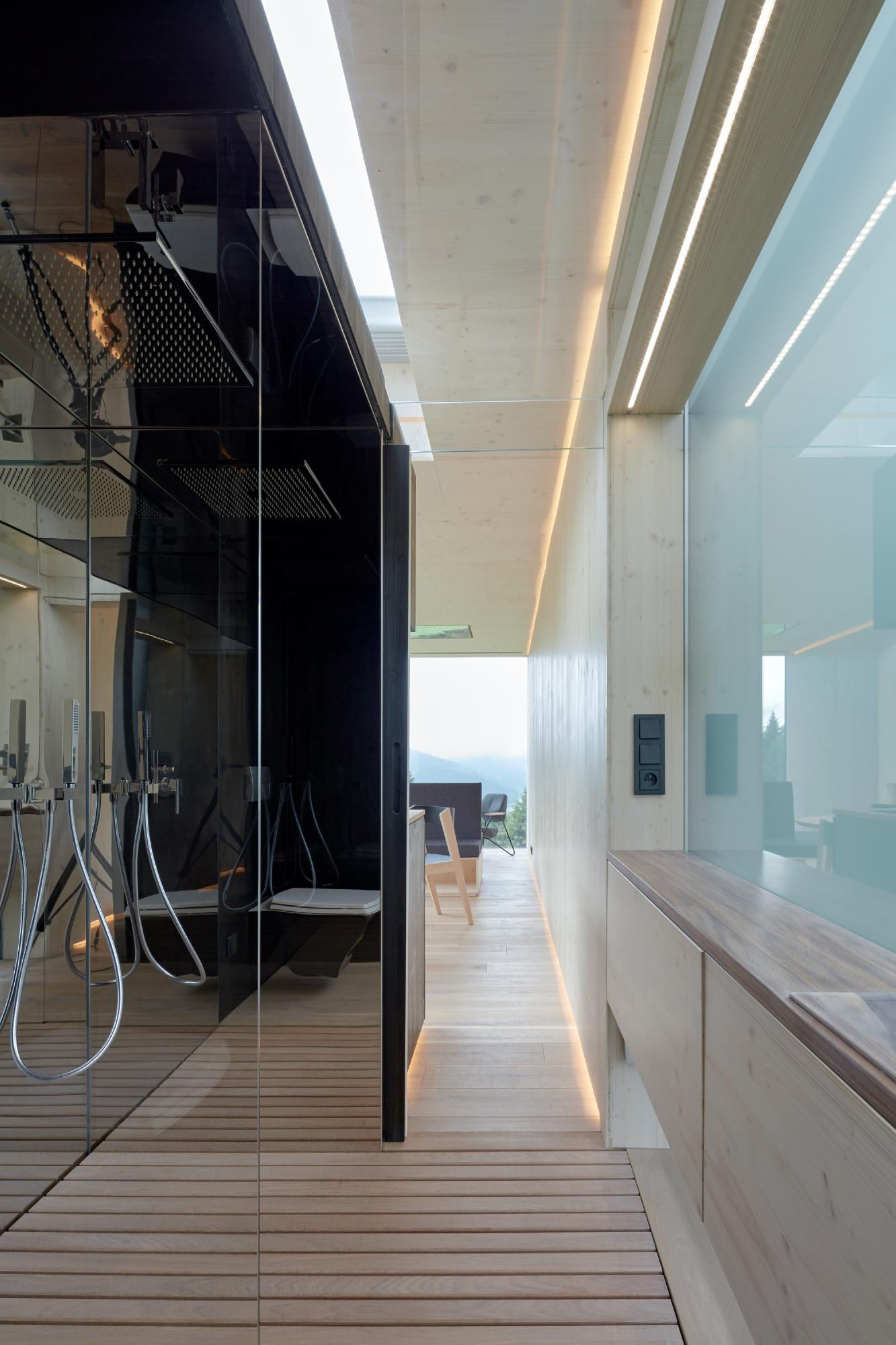 The exterior is clad in black-painted spruce to blend with the dark tones of the surrounding forest. The interiors feature light, minimalist materials, including spruce panels and oak floors, to create a warm and cozy atmosphere. Accommodation and wellness facilities