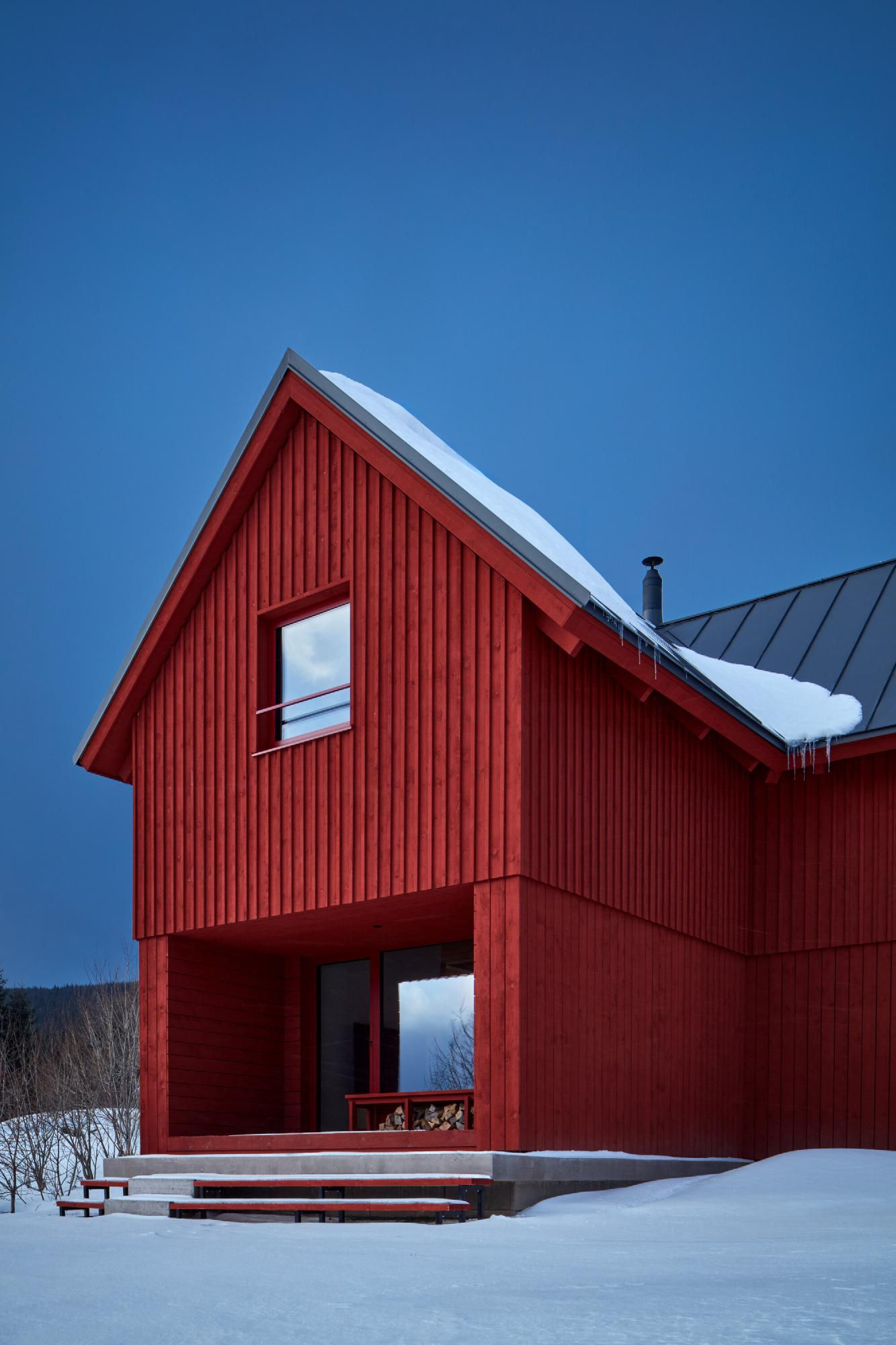 The Bučina Cottage is a contemporary residence for the manager of a ski resort in the village of Horní Malá Úpa, Czech Republic. Completed in 2023 by Prague-based architectural studio ADR, the cottage is inspired by the traditional timber architecture of the Krkonoše National Park region. Form: The cottage adopts an asymmetric cross-shaped plan, drawing on local building traditions. The cross morphology also serves to frame specific views of the surrounding landscape and mountain peaks, including Sněžka and Lysečina. Exterior: The exterior features a ventilated façade clad in unplaned spruce boards, painted a striking red, a color that is historically characteristic of mountain buildings in the area. The roof is covered with a corrugated metal sheet. Interior: The compact yet functional interior, designed for modern living, features a simple material palette. White-painted plaster walls are complemented by exposed structural timber beams, solid spruce flooring, and bespoke furniture crafted from the same material. Layout: Ground floor: The east-facing entrance leads into a vestibule, storage room, and an open-plan living, kitchen, and dining area. First floor: A spiral staircase, wrapped around a log-burning stove, leads to the upper floor, which contains two bedrooms, a bathroom, and a snug. Structural elements: The lightweight, prefabricated timber frame structure rests on a concrete foundation slab. This design allows the cottage to appear to float above the terrain in the summer, while remaining level with the snow cover during the winter. Credits Architects: ADR (Architektura Design Realizace), founded by Aleš Lapka and Petr Kolář. Client: Manager of the Malá Úpa ski resort. Location: Horní Malá Úpa, Krkonoše National Park, Czech Republic. Year of completion: 2023. Photography: BoysPlayNice.