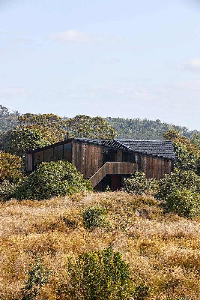 The dynamic geometry of the exterior is reflected in the interior, which features a variety of spatial experiences, from expansive, lofty areas to low, snug window seats. Openings and windows are strategically placed to maximize views of the natural environment, while solid walls on the opposite side provide refuge from the neighbouring suburbia. The warm, earthy colour palette of the materials, including rough-sawn timber flooring and black window frames, is chosen to allow the surrounding landscape to be the primary focus.