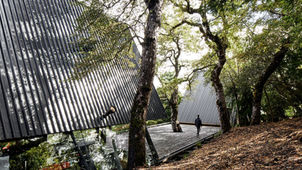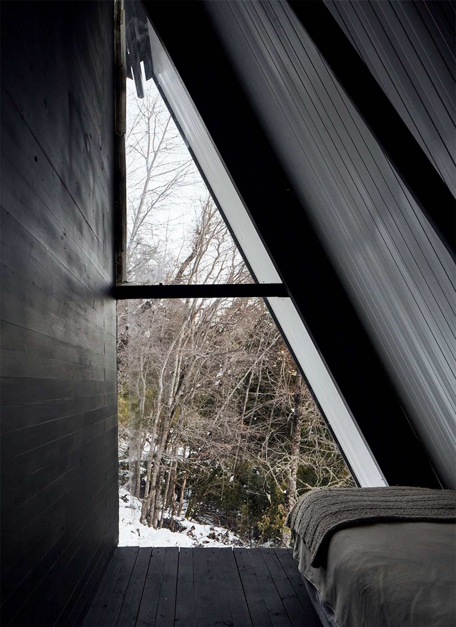 Completed in 2019, Casa Prisma is a secluded 184-square-meter retreat nestled in Conguillío National Park, Chile, designed by architect Smiljan Radić. The project is a conscious "exercise in repetition and replication," where Radić pays homage to two previous designs: Japanese architect Kazuo Shinohara's 1974 Prism House and his own 1997 Room built on the island of Chiloé. The off-grid, prefab cabin is composed of two distinct black volumes placed on a massive elevated timber deck, which offers views of the forest and a nearby solidified river of lava from a past volcanic eruption. Getting to the remote location required the building materials to be brought in via plane flights and car rides through rustic towns. The two structures of Casa Prisma each mirror one of the referenced designs. The first volume, known as the Room, features a gabled roof and was inspired by Radić's earlier work. The second, the Prism House, has a mono-pitched roof and replicates the isosceles triangle geometry of Shinohara's original design, including the interior's distinctive diagonal post. The exterior of both volumes is clad in black metal panels, with extensive glazing that allows light to pour into the spaces and frame panoramic views of the surrounding wilderness. The interior contains open-plan living and dining areas, with dorm-style bedrooms located in the upper A-frame section of one structure. Inside, red accent colors can be found on textiles and kitchenware, reminiscent of Radić's Room project. The home is designed for off-grid living, with solar panels and a battery bank providing power, and a wood-burning stove for heat. Credits Architects: Smiljan Radić Photography: Cristóbal Palma