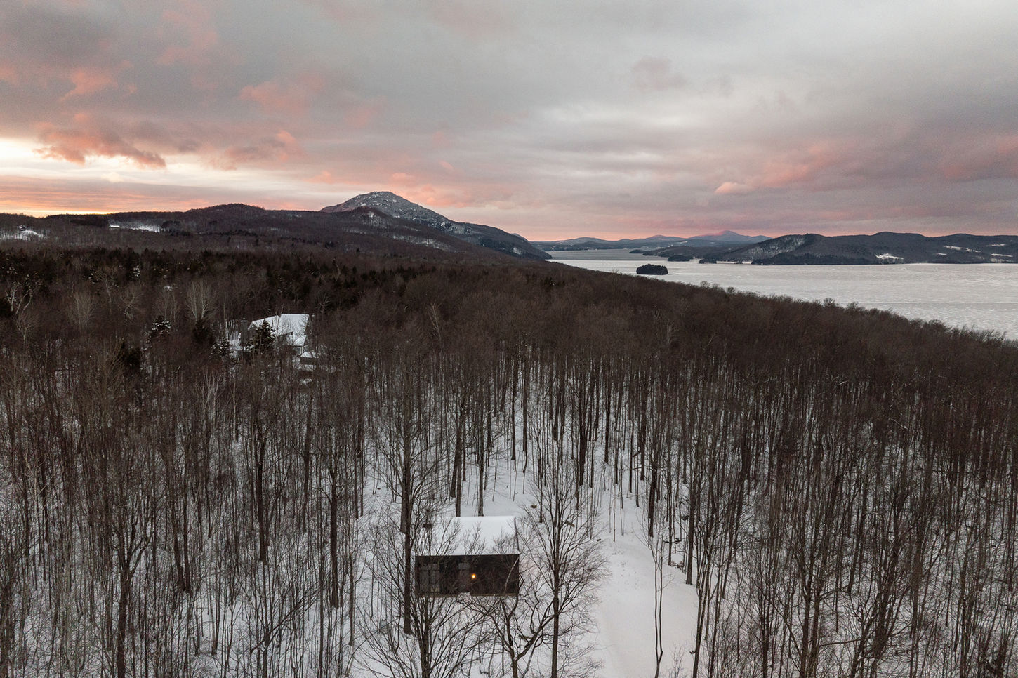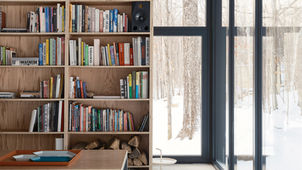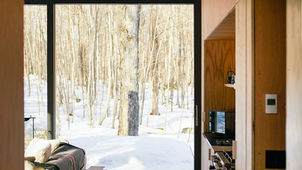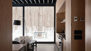Designed by Jérôme Lapierre Architecte, Casa Spinone is a secluded house located in the forest of Potton, Quebec, designed to prioritize a deep connection with its wooded environment. Completed in 2024, the house is a contemporary interpretation of a traditional wooden cabin. Its minimalist footprint and design focus on reducing its impact on the site's unique trees and rocks.