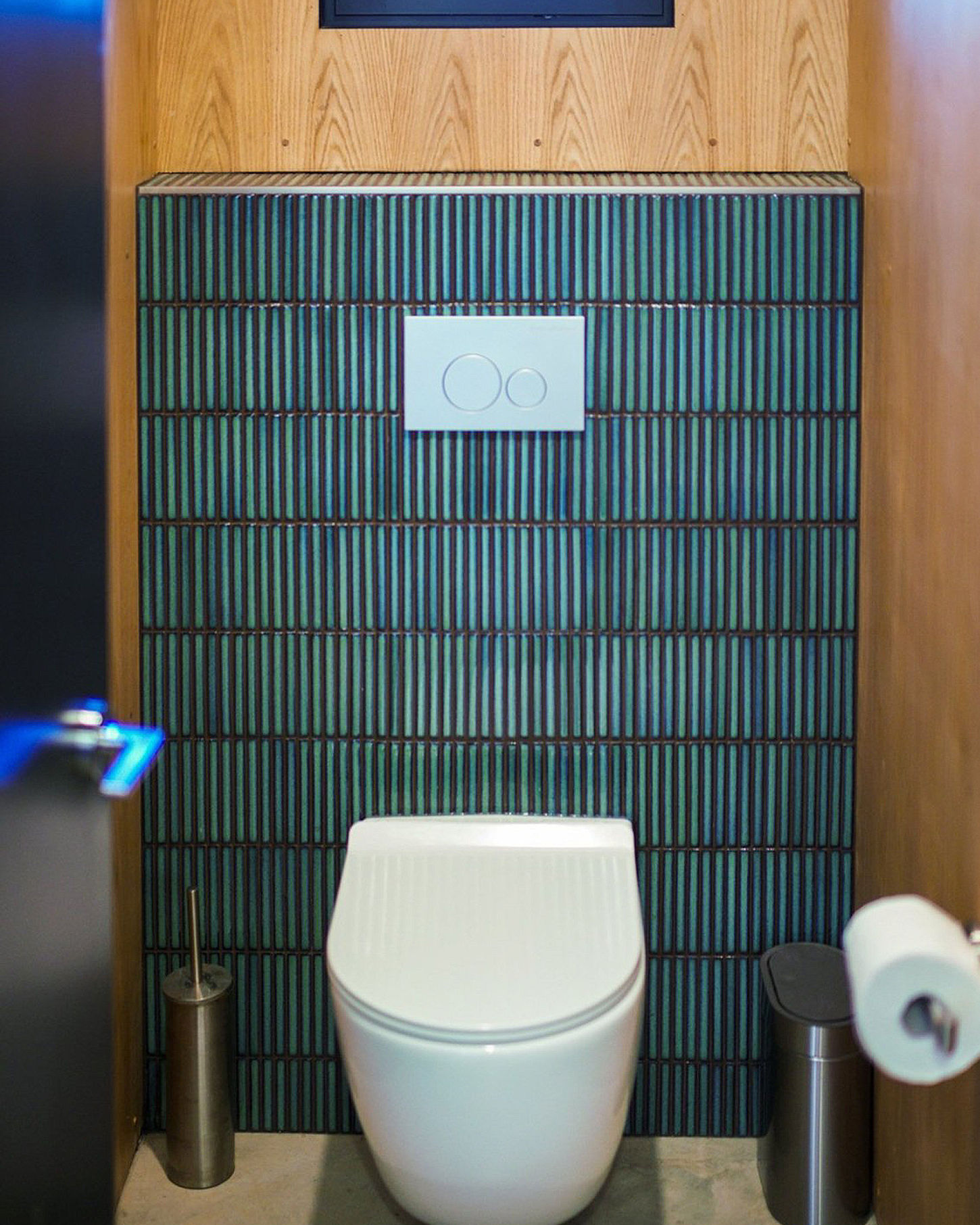 A low-ceilinged threshold marks the transition to the private night zone, which includes two bedrooms flanking a central block of water features.