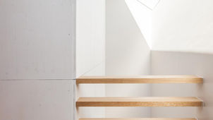 Throughout the interior, precise carpentry work creates seamless connections between spaces. Storage units and minimalist stairs are integrated flush into walls and surfaces, creating an abstract and uncluttered living environment.