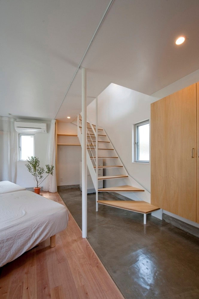 Situated on a narrow, triangular plot of land in the Horinouchi neighborhood of Suginami, Tokyo, the House in Horinouchi is a small, two-story residence designed by Mizuishi Architects Atelier for a couple and their daughter. Completed in 2011, the project is a testament to resourceful Japanese design, making ingenious use of a confined site nestled between a river and a road. The home's unusual shape is a direct response to the plot's acute angle, with the structure's volume pushing the boundaries of the permitted building envelope. The exterior is clad in metallic brown panels, creating a solid and distinct form with a cantilevered second floor that provides a small, sheltered parking space underneath. Despite its compact size of just 55.2 square meters (595 square feet) over two floors, plus a mezzanine loft, the interior feels more spacious than its footprint suggests. A "reverse" floor plan places the main living spaces on the second floor to take advantage of natural light and views over the adjacent river promenade. Large windows on both sides of the living area, including one that opens to a narrow balcony, frame long sightlines that extend the visual length of the house. A double-height ceiling in the kitchen area further enhances the sense of vertical space and connects to a small loft above, accessed by a ladder and illuminated by a large skylight. The ground floor houses a more private master bedroom, which, defined only by curtains, can expand visually into the adjacent stair hall. Project credits Architecture: Kota Mizuishi / Mizuishi Architect Atelier Structural Engineer: Kentaro Nagasaka Lighting Designer: Tatsuoki Nakajima Contractor: Hirano-Kensetu Photography: Hiroshi Tanigawa