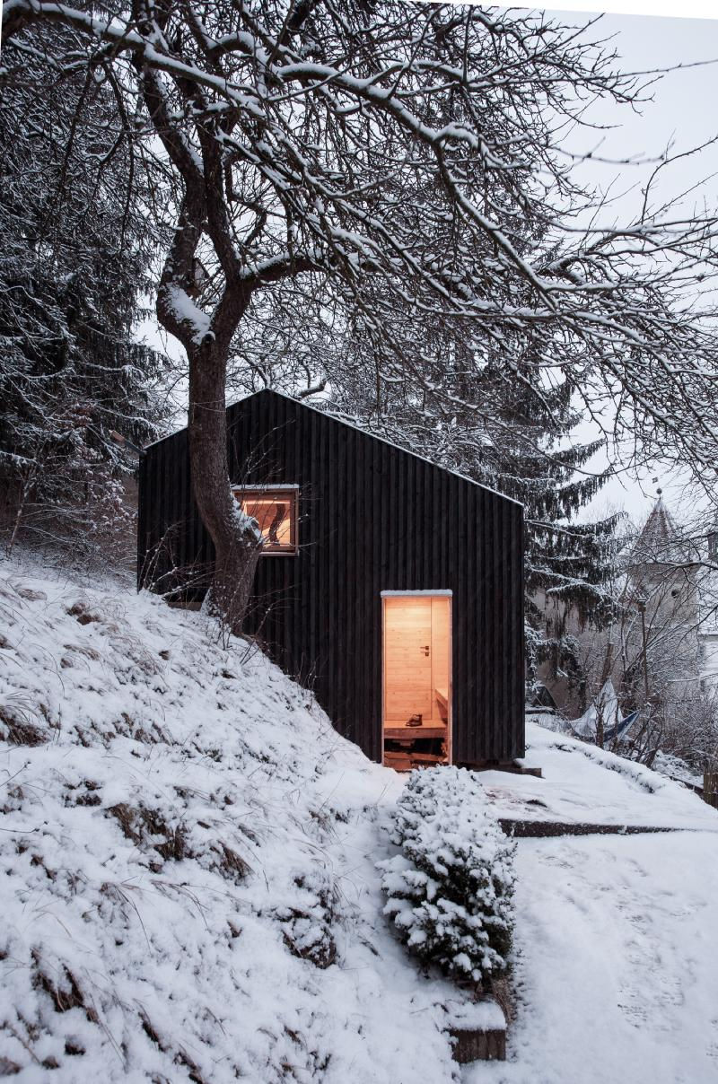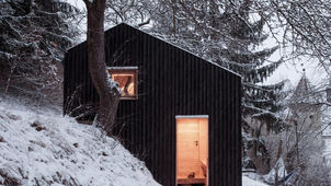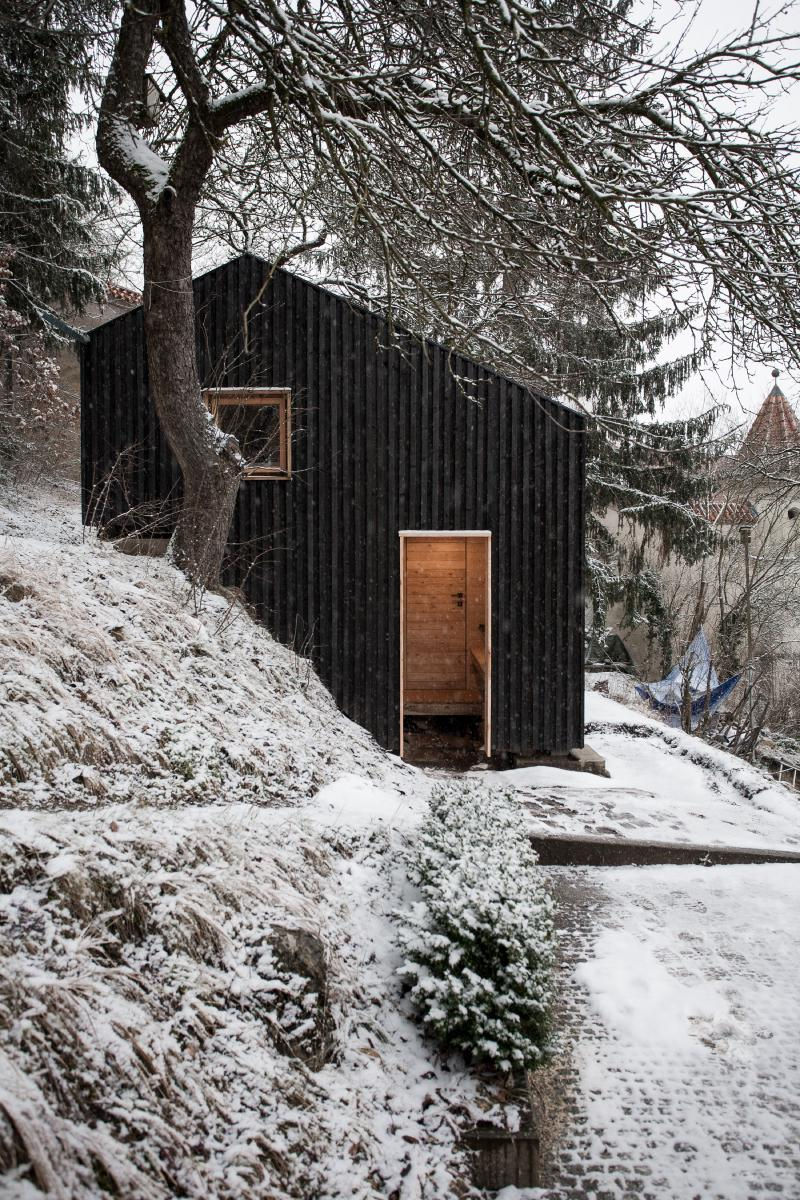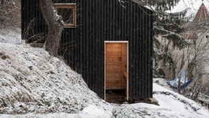 Designed, planned, and built by Sophie Kotter and Clemens Hoyer in 2019, KLEINHAUS is an experimental timber-construction project with a focus on sustainable, resource-saving, and regional materials. Inspired by its terraced hillside location, apple trees, and an old monastery wall, the small house is designed to integrate sensitively and phenomenologically with its surroundings. Its cubature follows the natural slope of the terrain, and this theme of multiple levels continues into the interior, creating a single, open-plan space for living, working, and sleeping. Instead of fixed partitions, the one-room space uses subtle shifts in level to define different zones, forming niches, seating areas, and platforms. A unique and central feature of the house is an apple tree that grows through the structure, serving as a living object. Inside, the material palette is raw and minimalist, with new insertions in concrete, birch plywood, and blackened steel, while original surfaces were preserved where possible. With the support of the clients, the project was realized in just six months. Credits Architects: Sophie Kotter and Clemens Hoyer Photography: Milan Loebner