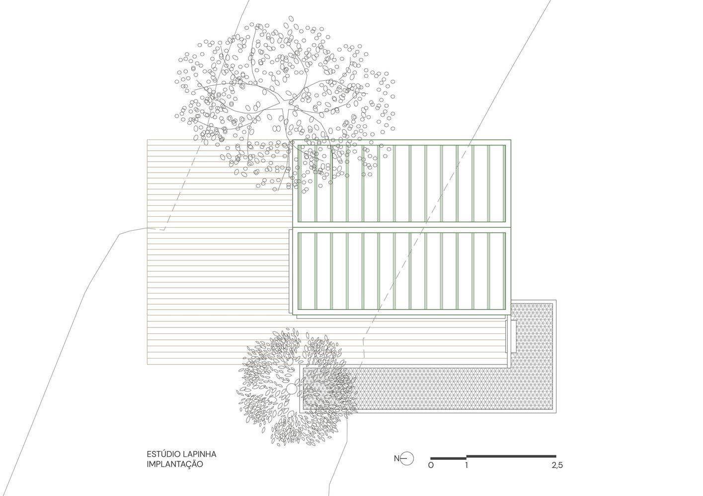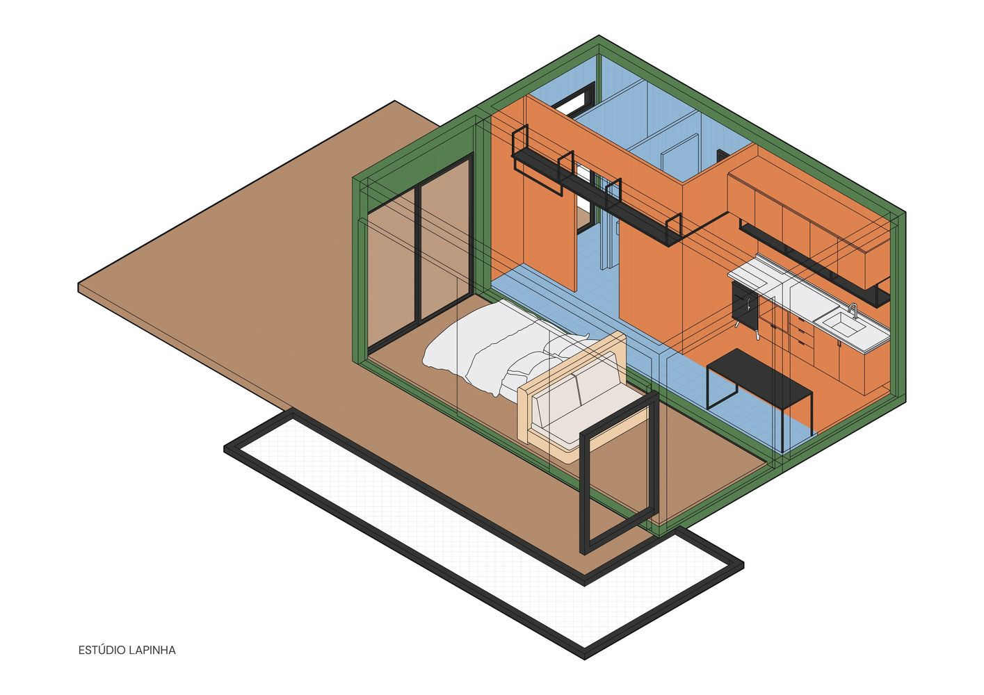 We were challenged to design a structure for CASACOR Minas Gerais that could be dismantled and later reassembled in Lapinha da Serra, where it would be used for accommodation. The constructive reasoning guided the project: we attached two container modules laterally and took advantage of the characteristics of this system, exposing the industrialized construction components without camouflage. In the Lapinha Studio, we concentrated all the hydraulic systems on one wall, creating the infrastructural module. This design strategy reduced costs and freed up the rest of the space. Therefore, the other container serves as a flexible, indeterminate module—a free plane—that, in this edition, houses the furniture of the Lapinha Studio. More than just a physical space, we present an idea—a prototype to be expanded, replicated, and implemented in other contexts. Different arrangements of containers create different spaces for various lives to unfold there. Inside, we aimed to highlight the meeting point between the containers to emphasize the construction system itself. The materials differentiate the infrastructural module from the flexible one. The colors bring the natural landscape of the next location of deployment, Lapinha da Serra, inside this refuge.