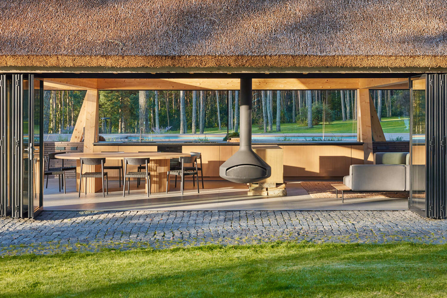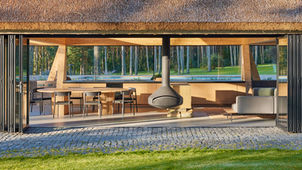 The Poolhouse in Vilnius, designed by HEIMA architects and completed in 2022, is a 150-square-meter building that serves as a recreational space in a recreational complex. Located in a hilly valley near an existing basin, the triangular building's position was chosen to optimize the views of the surrounding natural landscape. The architectural design is notable for its heavy, archetypal, and steeply pitched roof, which creates a strong visual contrast with the extensive glazing that encircles the building. This transparency makes the roof appear to hover in the air, blurring the distinction between the interior and exterior and allowing the building and its surroundings to be enjoyed throughout the year. The design also subtly references ethnic Lithuanian house-building traditions through its wooden roof structure, with its repetitive trusses and 120-centimeter-high beams. A central skylight is integrated into the roof to provide additional natural light. Inside, the interior is modern and follows the same grey-brown color and material palette as the exterior, reinforcing the connection to nature. The space is organized around three central elements: a fireplace, a kitchen island, and a core volume that contains the utility rooms. This arrangement keeps the perimeter free, emphasizing the open floor plan and the unimpeded views offered by the wide-opening windows. Outside, the project includes an outdoor swimming pool, a small sand beach, and a BBQ area. The entire structure is designed to function as a seamless part of its natural setting. Credits Architects: HEIMA architects Lead Architect: Povilas Žakauskas Photography: Norbert Tukaj Manufacturers: Focus, Wastberg Location: Vilnius, Lithuania Completion Year: 2022