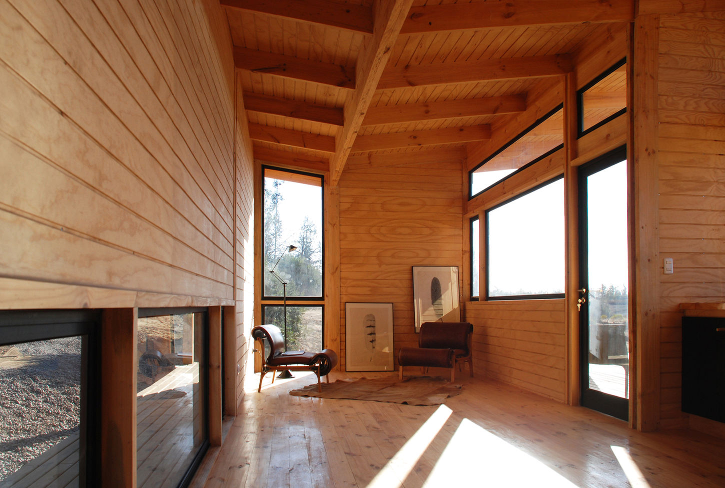 The entire structure is made of dimensioned wood, with composite pillars, beams, and trusses left exposed to serve as the building's final expression. Partitions are constructed from Structural Insulated Panels (SIPs), which offer high thermal performance. The exterior is clad in a rough horizontal shed siding. The walls and ceilings are finished with slotted plywood.