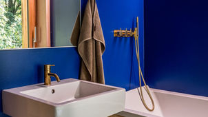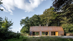 Completed in 2020, The Author's House is a private, 68-square-meter writing and living retreat designed by Danish architectural firm SLETH. Situated in a protected forest near Aarhus, Denmark, the cabin is a contemporary interpretation of the classic woodland cabin, designed to harmonize with its natural surroundings. It was built on the existing plinth of a previous summer house, adhering to the area's strict building regulations. The client, a writer, sought an inspirational workspace that offered a close connection to nature, rather than a traditional holiday home. This focus on work over residence is reflected in the layout, which dedicates most of the space to a large, flexible living and studio area, with only a small sleeping loft and bathroom. The design emphasizes the transition between inside and out. Large, sliding glass doors allow the interior to extend onto an outdoor terrace, a feature that allows the writer to work in direct connection with the forest. The exterior is clad in a dark, reddish-brown copper, chosen to blend with the trunks of the surrounding beech trees and a nearby lake. This copper façade will naturally patinate over time, gradually turning green to further integrate the structure into the landscape. Inside, the material palette is warm and natural. The flooring, a mottled aggregate concrete, mimics the forest floor and extends out onto the terrace to blur the line between interior and exterior spaces. The interior is dominated by Douglas fir wood from Danish manufacturer Dinesen, used for the ceilings, built-in furniture, kitchen, staircase, and the home's walls, which are also lined with bookcases. In a splash of vibrant color, the fireplace is painted in a deep, electric blue. The project also features sustainable measures, including geothermal heating and an efficient use of materials, where leftover wood planks were used for additional furnishings. Credits Architects: SLETH (Søren Leth, partner and lead architect) Photography: Rasmus Hjortshøj – COAST Contractor: Tømre-Snedkerfirmaet Aps Keld Ellegaard Sørensen Engineer: Ivar Lykke Christensen A/S Floors: FLIB BYG Aps Furniture and Interior Materials: Dinesen (Douglas fir wood)