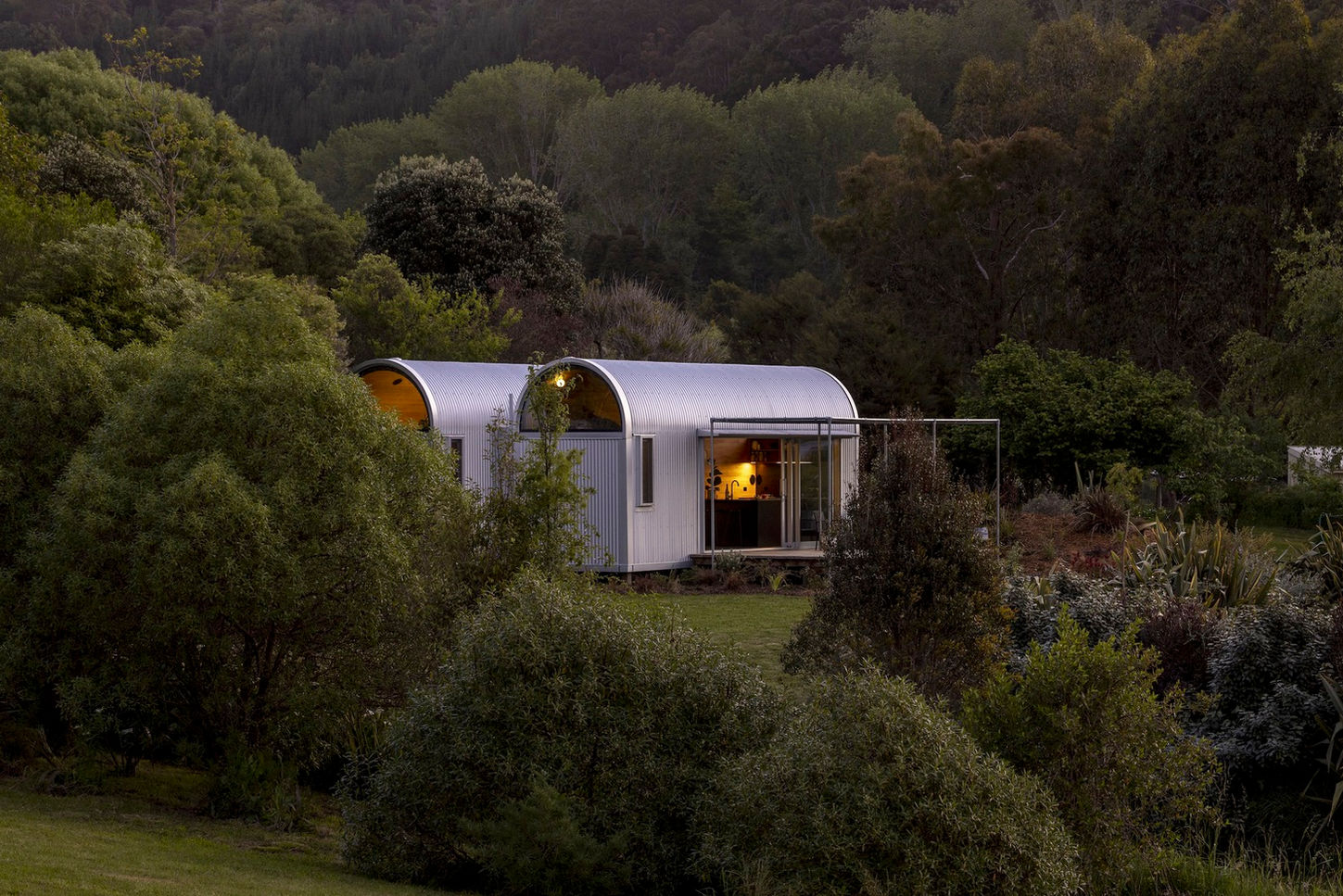 Located in Nelson, New Zealand, the Studio House is a 42-square-meter relocatable home designed by architect William Samuels and his partner, Hannah D'Arcy, and completed in 2022. The project was an experimental, hands-on response to New Zealand's housing crisis, with the couple building the home themselves over 18 months on a limited budget. The project demonstrates an affordable and sustainable path to homeownership, prioritizing liveability and a smaller footprint over size. The house is composed of two timber-framed, barrel-vaulted modules placed side-by-side. This modular approach allows the home to be easily disassembled and relocated via a flatbed truck, offering a flexible and "permanently relocatable" living option. Corrugated metal panels clad the exterior, while a barrel-vaulted ceiling brings in natural light through large, curved windows at either end of each module. The interior of the Studio House uses natural materials, including rimu timber cladding on the walls, and contains no paint. The barrel-vaulted ceilings create a sense of spaciousness, while the window frames are hidden within the wall cavity to provide an uninterrupted view of the surrounding tree canopies. The layout features a loft above the bathroom, which serves as a cozy reading room with views, and a large sliding glass door opens onto a deck to extend the living space outdoors. The house is designed to evolve over time, with the option to add more modules for bedrooms or workspaces in the future. Credits Architects: William Samuels Architects (William Samuels) Design and Construction: William Samuels and Hannah D'Arcy Photography: Simon Devitt Client: William Samuels and Hannah D'Arcy Manufacturers: Autex, APL NZ, Jacobsen, Polyfloor, Valchromat MDF coloured