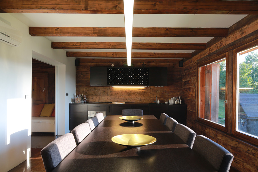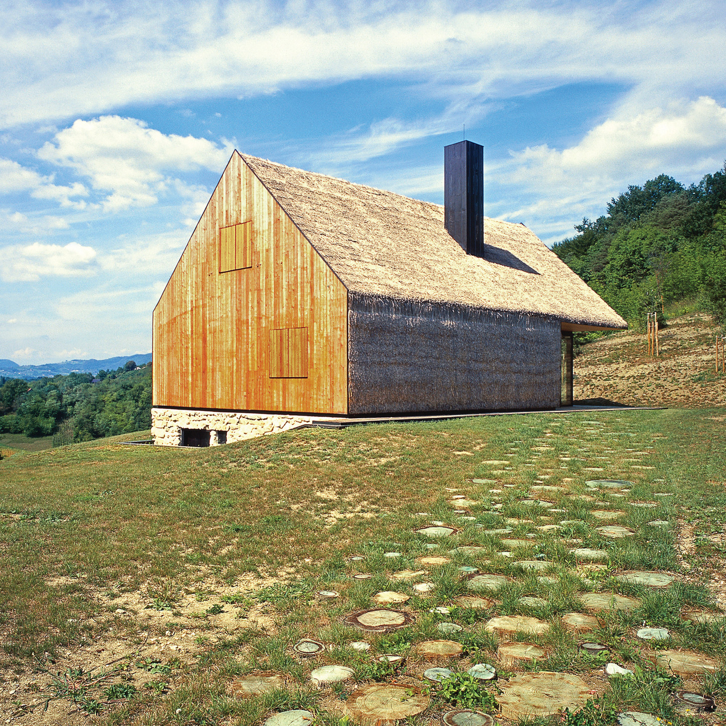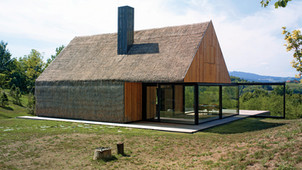 The Hiža house is a 230-square-meter renovation project by the Zagreb-based firm PROARH, led by architect Davor Matekovic, completed around 2015. Located on the green slopes near Kumrovec in the Zagorje region of Croatia, the project transformed a dilapidated, decades-old cottage into a modern and organic living space that honors local heritage. The design reinterprets traditional cottage architecture by combining natural materials with a bold, contemporary intervention. The main architectural feature of the renovation is the addition of a sleek glass and aluminum cube that replaces the old porch and slides outwards from the main thatched volume. This addition serves as a dynamic entrance and a living area that is oriented to receive maximum southern exposure. With sliding glass walls, the cube blurs the lines between indoor and outdoor spaces and opens up to a new wooden terrace that appears to hover over the hillside, offering expansive views of the Zagorje landscape. The traditional cottage form was preserved, but the architects enhanced its material palette by using locally sourced, rustic materials. The original thatched roof was replaced with a new one that extends down over the façade, and the gables were re-clad with wood. This innovative use of straw, considered an archaic material, creates a warm and earthy exterior that contrasts with the minimalist glass cube. The renovation also preserved the cottage's original stone pedestal, grounding the updated structure in its history. A pathway made of tree stumps leads to the entrance, further connecting the home with its natural surroundings. Inside, the house is organized across three floors: a basement, a ground floor for common living spaces (leisure, dining, and cooking areas), and a first floor for the sleeping areas. The ground floor is arranged around a central "hearth" in the traditional Zagorje manner. This approach of reinterpreting traditional construction technologies and using local, renewable resources demonstrates a commitment to sustainable, low-impact design. The project has received recognition, including being shortlisted for a World Architecture Festival Award in 2015. Credits Architects: PROARH (led by Davor Matekovic) Photography: Damir Fabijanić