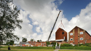The Dovecote Studio is a striking piece of adaptive reuse architecture designed by Haworth Tompkins for the internationally renowned Snape Maltings music campus in Suffolk, England. Completed in 2009, the 30-square-meter studio is built within the dramatic, derelict brick ruins of a 19th-century dovecote, which sits prominently on the edge of the marshes overlooking the North Sea. The design approach was to preserve the poetic decay of the existing ruin while inserting a contrasting modern structure within it.