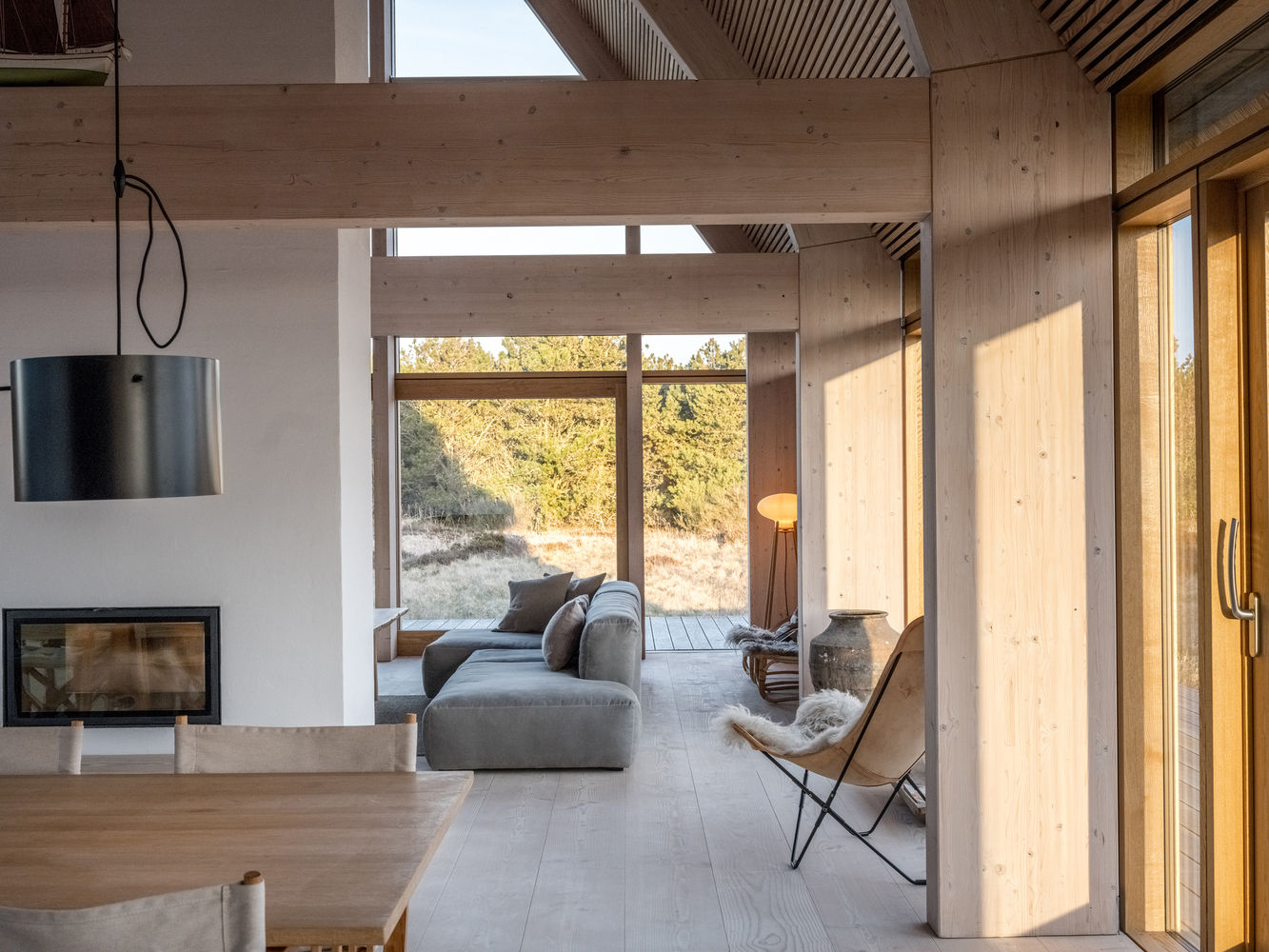 Situated in the northernmost point of Denmark, the Skagen Klitgård House by PAX Architects is a contemporary summer home that pays tribute to the town's architectural history. Designed for a multi-generational family, the 288-square-meter residence strikes a balance between open communal areas and secluded spaces for private retreat. The project was completed in 2021. The house draws inspiration from Skagen's "Black Period," when charred wood from shipwrecks was used to build houses. This history is echoed in the distinctive black-painted wooden exterior and a traditional thatched roof, which help the house blend seamlessly into the surrounding dunes and landscape. Inside, the layout is designed to foster a sense of togetherness while still allowing for solitude. The entire house is covered by a continuous pitched roof, creating a feeling of "being under one roof" regardless of where you are in the house. The heart of the home is a centrally located kitchen that overlooks the dining room, encouraging family gatherings. In contrast, more intimate spaces, such as a multi-purpose room behind the kitchen, have lower ceiling heights to create a more personal atmosphere. The interior features a warm, muted palette with extensive use of sustainably sourced Douglas fir wood from the Danish company Dinesen. Large windows and sliding glass doors blur the line between indoor and outdoor spaces, framing views of the landscape. Project credits Architects: PAX Architects Photographer: Coast Studio Manufacturer (Douglas Fir): Dinesen Project Development: Mathias Brockdorff