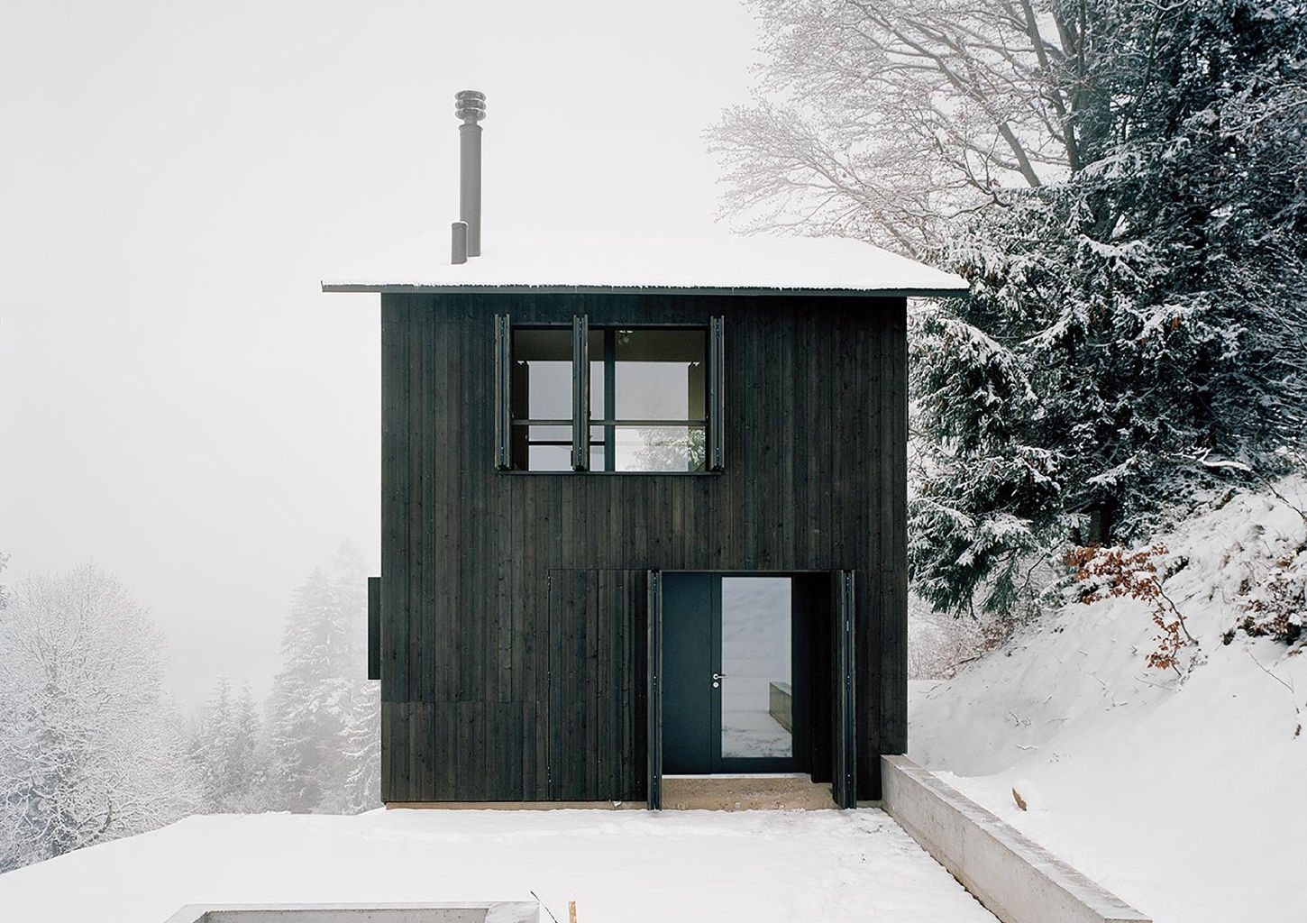 Nestled into a sloping, forested site in the Swiss Alps, the Holiday House Aulina is a compact and refined 53-square-meter cabin designed by Oliver Christen Architekten. Built in 2021 as a replacement for an older structure, the house is located in the Flumserberg-Bergheim area, where it offers its inhabitants almost uninterrupted views of the surrounding woodland, mountains, and Lake Walen. The design concept likens the compact building to a "casket," carefully blending it into the landscape. The exterior is a striking, dark wooden volume with a classic gabled roof. The vertical charred-wood cladding is arranged at different depths, creating a rich texture that changes depending on the light and the viewer's perspective. The facade has a changeable character, thanks to foldable wooden shutters on the ground floor. When the house is unoccupied, these shutters can be closed, making the house appear more reserved and protected. When the owners are present, the shutters open to connect the interior with the surrounding scenery. In stark contrast to the dark exterior, the interior is bright and minimalist, defined by the use of light birch plywood surfaces. This choice of material creates a warm and inviting atmosphere, with built-in storage and joinery seamlessly integrated into the walls to maximize space. The floor plan is organized vertically, with a "reversed" layout. The ground floor contains the bedrooms, a bathroom, and a workspace, while the upper floor is dedicated to the kitchen, dining, and living areas. This arrangement allows the main living spaces to benefit most from the panoramic views. Project credits Architects: Oliver Christen Architekten Photography: Rasmus Norlander Location: Flumserberg, St. Gallen, Switzerland