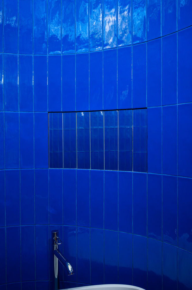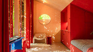 Nestled in a family allotment garden in Warsaw, Poland, the House of Color Downtown Oasis is a vibrant, 35-square-meter tiny house designed by NOKE Architects. Inspired by the colorful personalities of its owners, singer and artist Magda Grabowska-Wacławek and her husband, animator Grzegorz Wacławek, the retreat serves as a tranquil escape from city life. Its electric red color palette and maximalist design aesthetic boldly translate the owners' creative spirit into architectural form. The location, a triangular-shaped plot, presented a key constraint: the regulations for allotment gardens mandate that permanent structures cannot exceed 35 square meters. NOKE Architects used this limitation to their advantage, designing a compact cottage that maximizes both form and function. The house is intentionally hidden from the street and only gradually reveals itself as one moves through the lush, free-growing greenery of the garden. This sense of discovery begins with a winding path of red stones, complemented by a glowing art installation, that leads visitors from the street. Inside, the compact space integrates a living area, kitchen, workspace, sleeping nook, and bathroom. The vibrant color scheme extends indoors, with plywood walls and ceilings stained with natural, eco-friendly oils. The interior palette balances the expressive colors with more muted wood tones and gray flooring. Large-format glazing visually dissolves the barrier between the interior and the garden, and can be opened to extend the living space onto the terrace. A quirky, semicircular window adds an artistic touch and offers a unique vantage point of the garden. A concealed entrance and a red, chimney-like volume housing the bathroom add an element of playful secrecy to the design. The bathroom itself is a surprising sensory experience, with cobalt tiles, mirror panels, and a glass roof that allows for stargazing while bathing. Project credits Architecture: NOKE Architects Design Team: Karol Pasternak, Piotr Maciaszek, Mateusz Jaworski Photography: Piotr Maciaszek Set Design: Ania Witko Client: Magda Grabowska-Wacławek and Grzegorz Wacławek